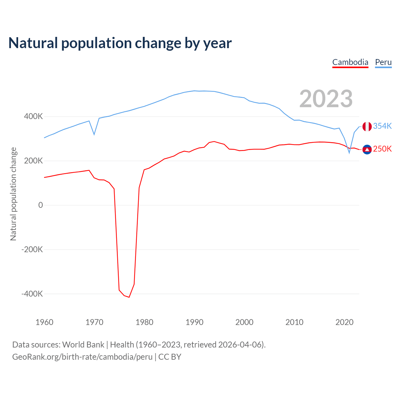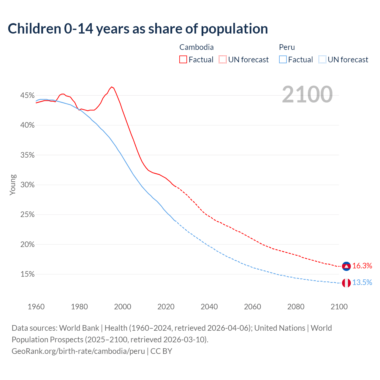 According to the latest available data on birth rates, the fertility rate in Cambodia was 2.58 children per woman in 2023, compared to 1.98 in Peru in 2023. The replacement level is considered to be 2.1 children per woman.