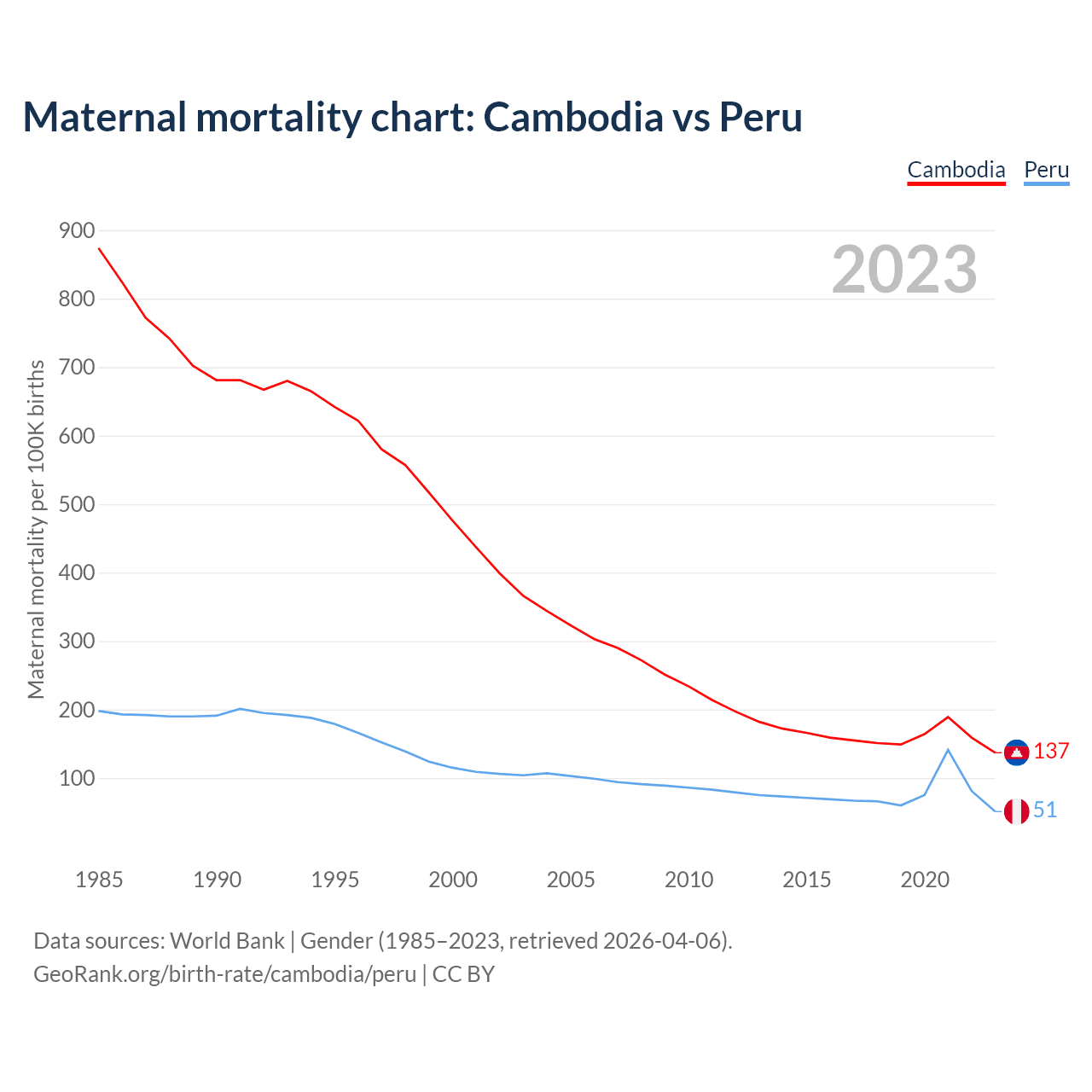 The maternal mortality rate, which is the probability of dying during childbirth or within 42 days of pregnancy termination, is 137 deaths per 100,000 live births in Cambodia, compared to 51 deaths in Peru.