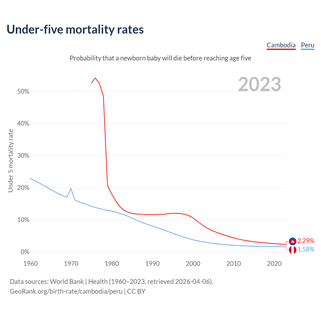 The chance that a newborn baby will die before reaching age five is 2.29% in Cambodia and 1.58% in Peru. Above is a chart with historical data on under-five mortality rates.