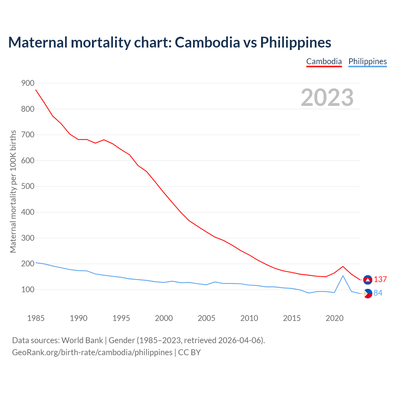 Data sources: World Bank | Gender (1985–2023, retrieved 2026-04-06).