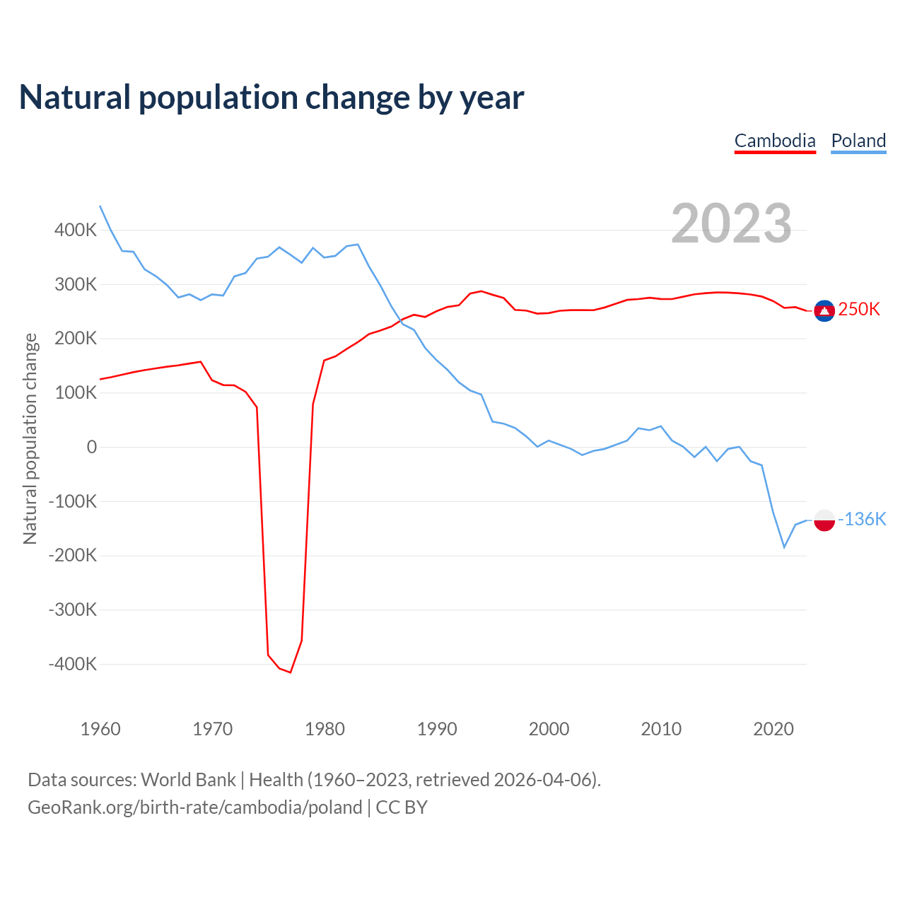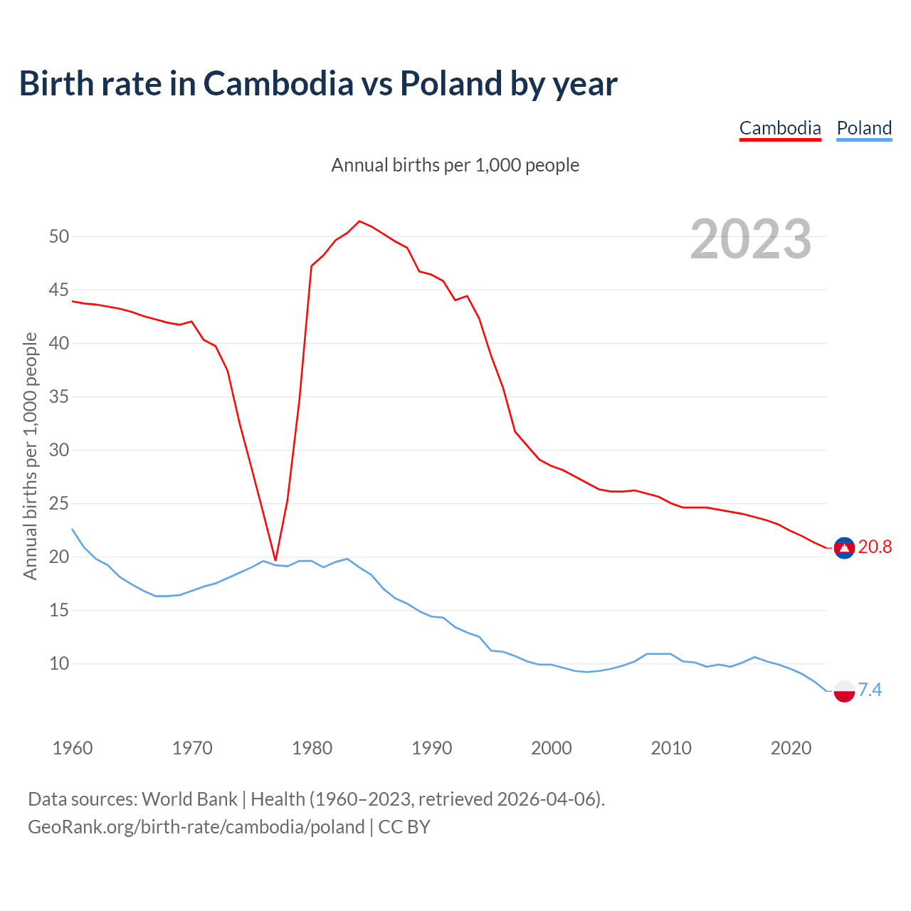 Cambodia has an annual birth rate of 20.8 births per 1,000 people, compared to 7.4 for Poland. The average number of children a woman is expected to have during her lifetime — the fertility rate, is 2.58 in Cambodia and 1.16 in Poland — 55.1% difference.