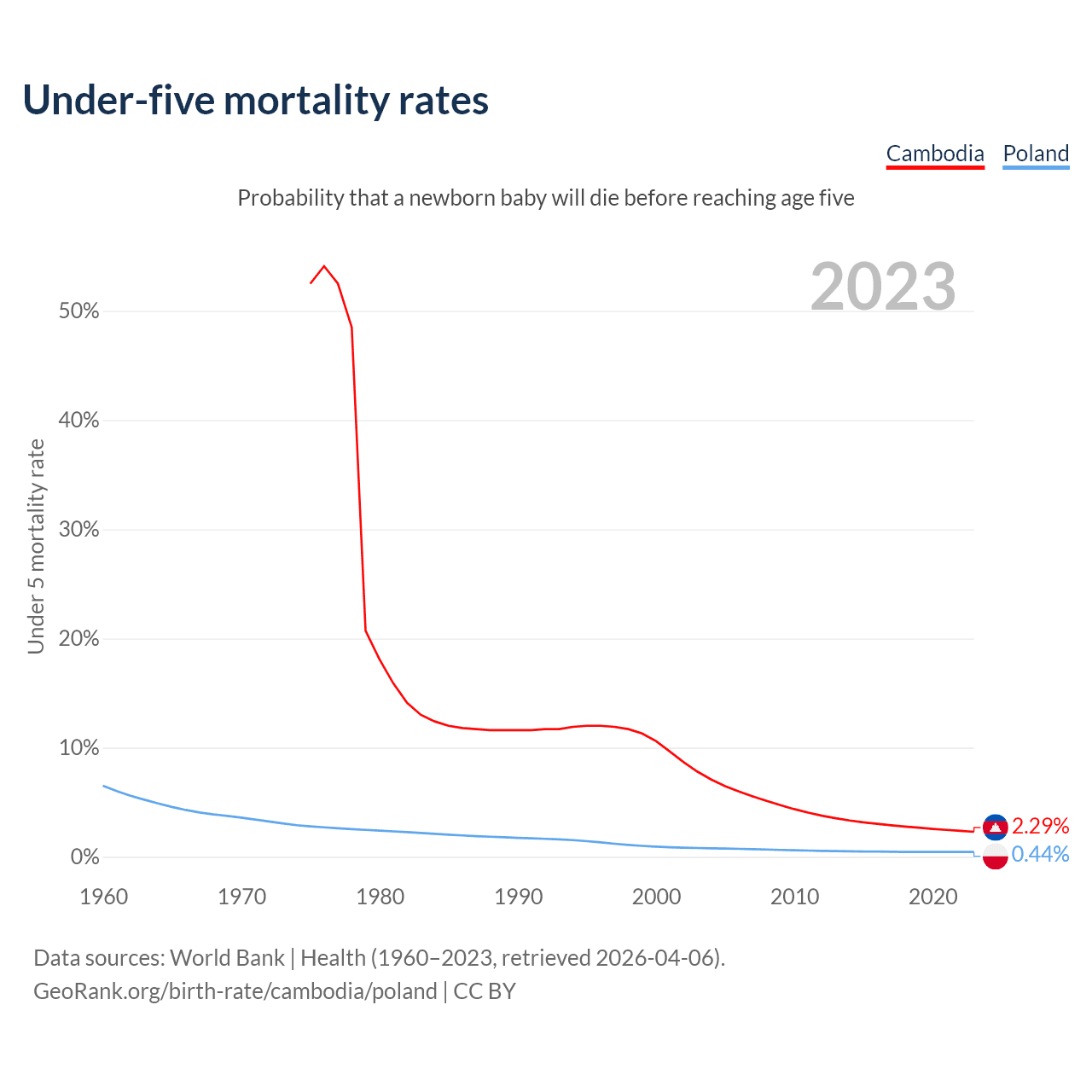 The chance that a newborn baby will die before reaching age five is 2.29% in Cambodia and 0.44% in Poland. Above is a chart with historical data on under-five mortality rates.