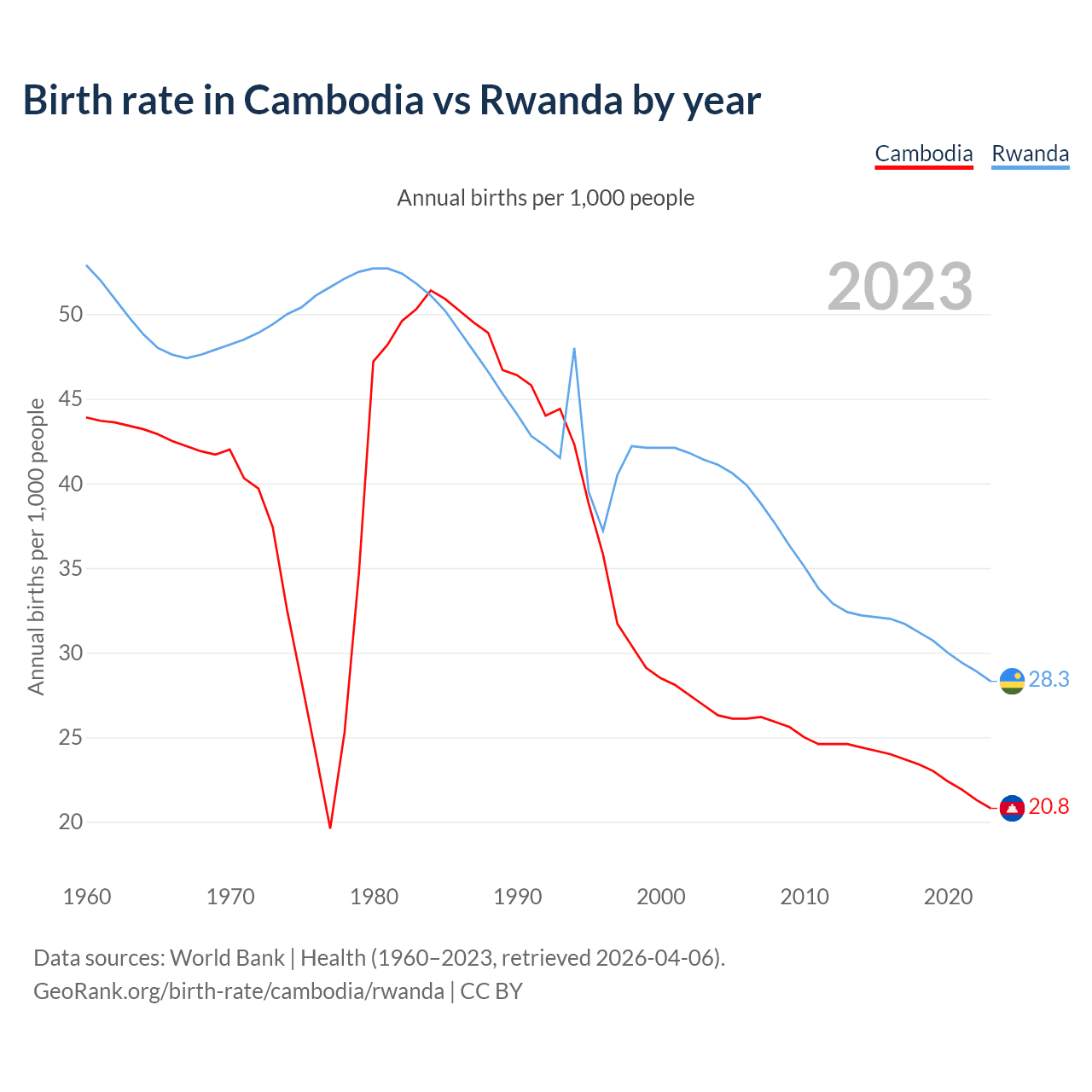 Cambodia has an annual birth rate of 20.8 births per 1,000 people, compared to 28.3 for Rwanda. The average number of children a woman is expected to have during her lifetime — the fertility rate, is 2.58 in Cambodia and 3.7 in Rwanda — 43.4% difference.