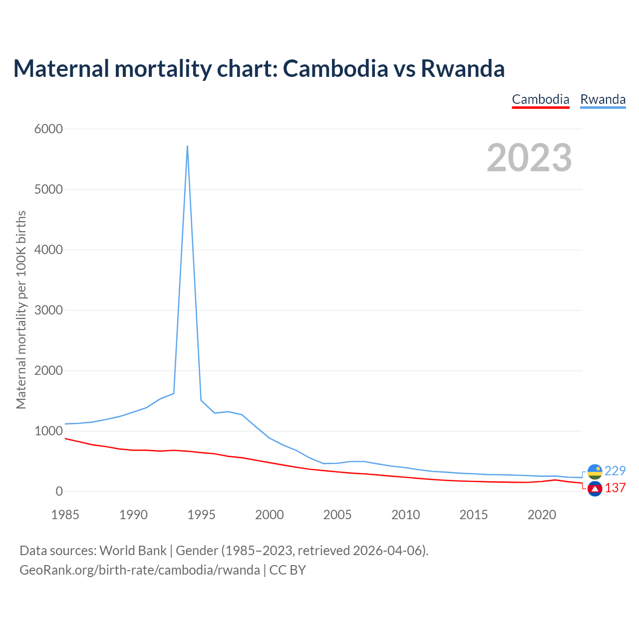 The maternal mortality rate, which is the probability of dying during childbirth or within 42 days of pregnancy termination, is 137 deaths per 100,000 live births in Cambodia, compared to 229 deaths in Rwanda.