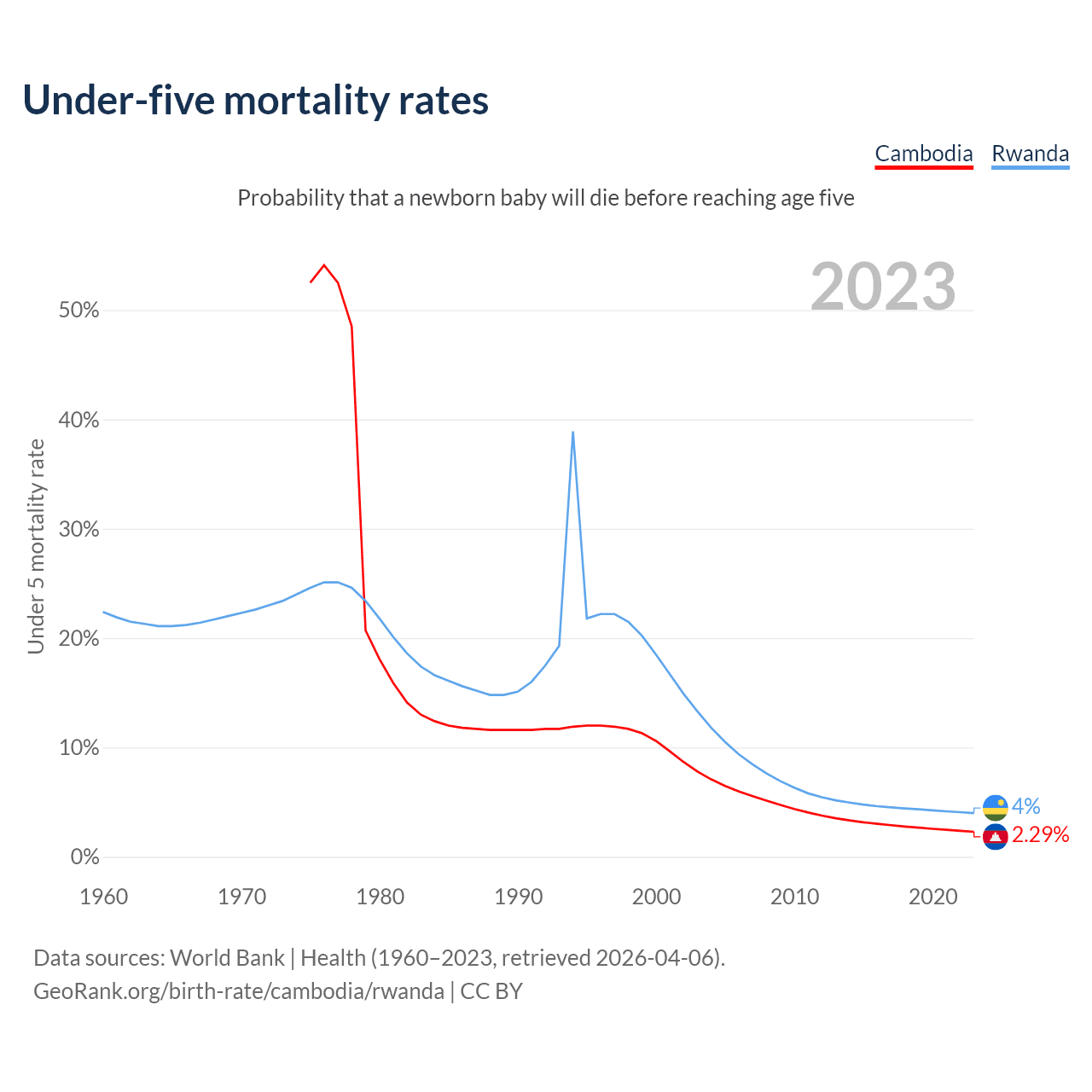 The chance that a newborn baby will die before reaching age five is 2.29% in Cambodia and 4% in Rwanda. Above is a chart with historical data on under-five mortality rates.