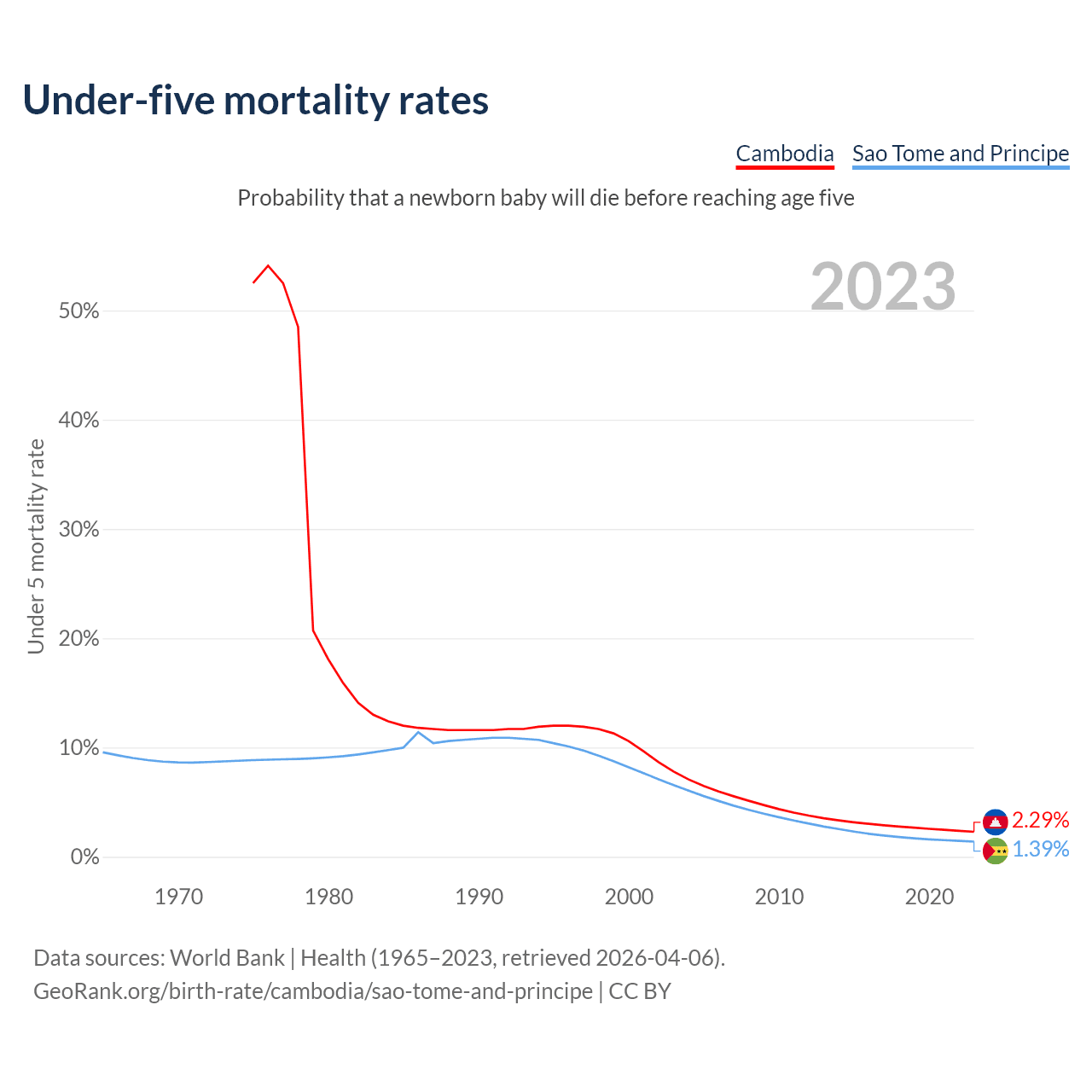 The chance that a newborn baby will die before reaching age five is 2.29% in Cambodia and 1.39% in Sao Tome and Principe. Above is a chart with historical data on under-five mortality rates.