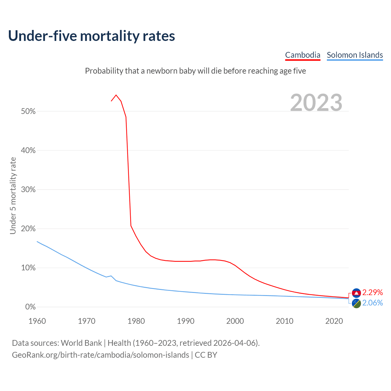 The chance that a newborn baby will die before reaching age five is 2.29% in Cambodia and 2.06% in the Solomon Islands. Above is a chart with historical data on under-five mortality rates.