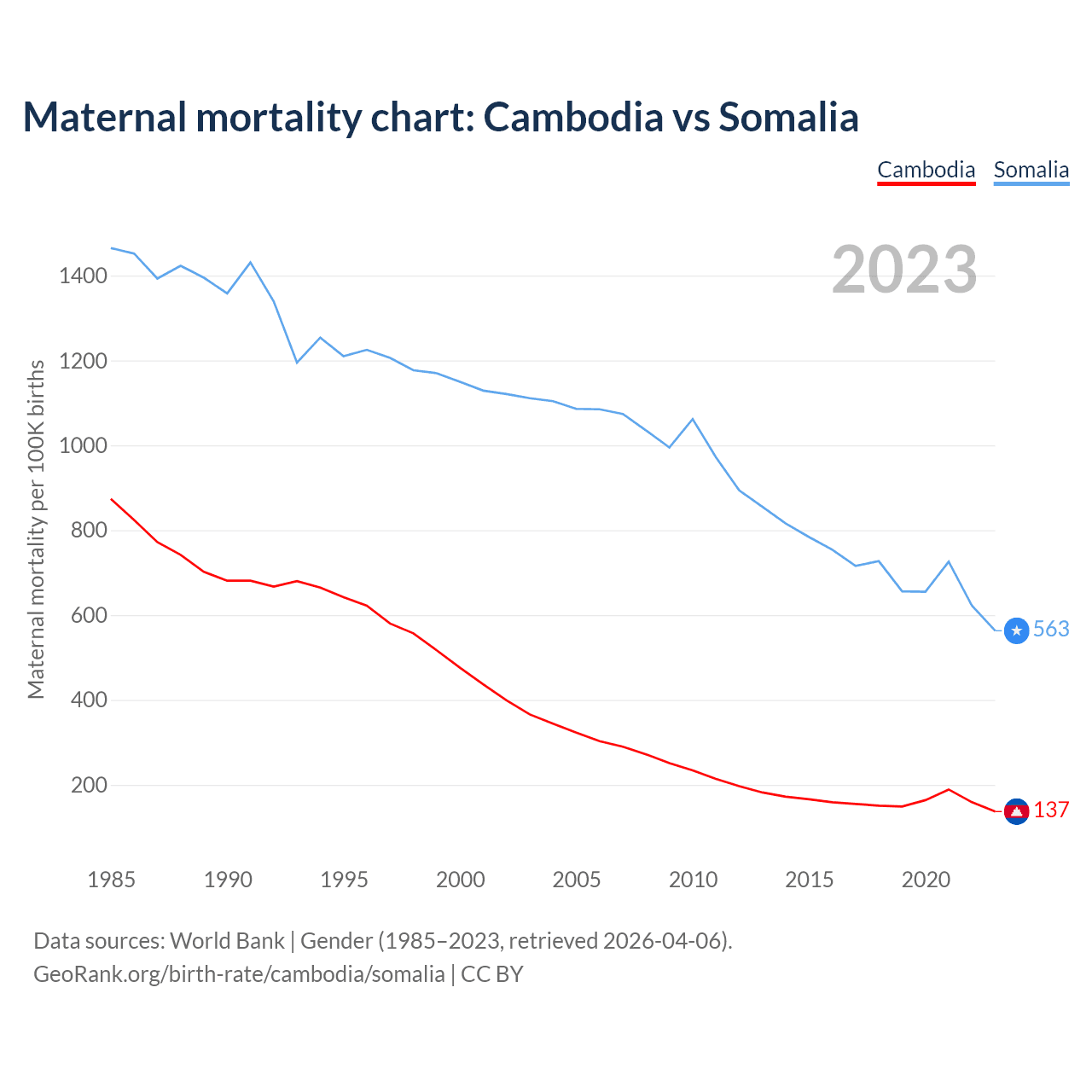 The maternal mortality rate, which is the probability of dying during childbirth or within 42 days of pregnancy termination, is 137 deaths per 100,000 live births in Cambodia, compared to 563 deaths in Somalia.
