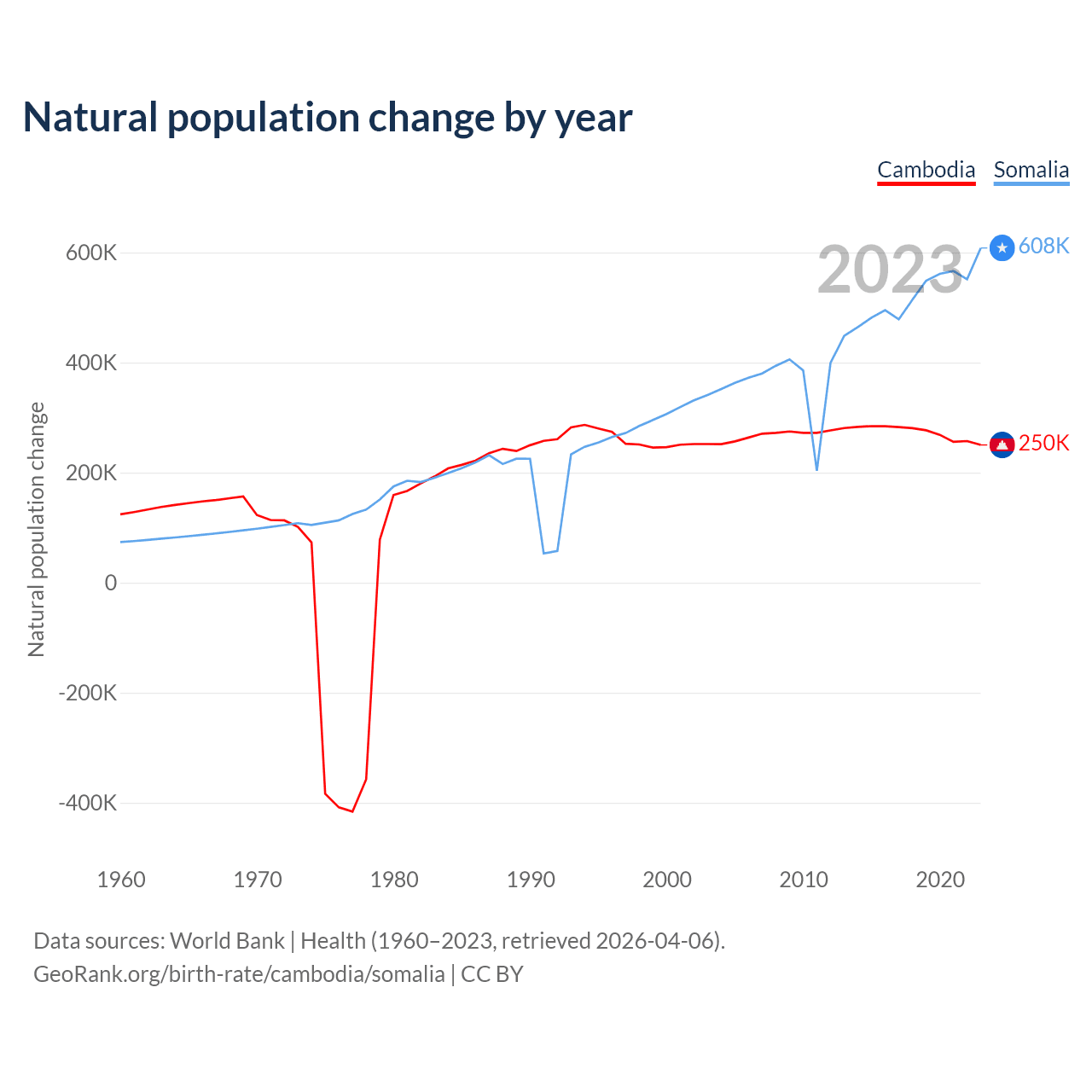 Cambodia has an annual birth rate of 20.8 births per 1,000 people, compared to 43 for Somalia. The average number of children a woman is expected to have during her lifetime — the fertility rate, is 2.58 in Cambodia and 6.13 in Somalia — 137.8% difference.
