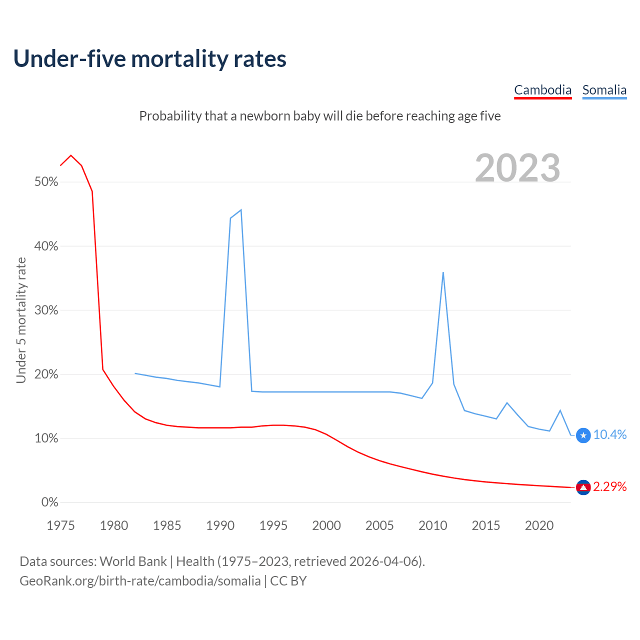 The chance that a newborn baby will die before reaching age five is 2.29% in Cambodia and 10.4% in Somalia. Above is a chart with historical data on under-five mortality rates.