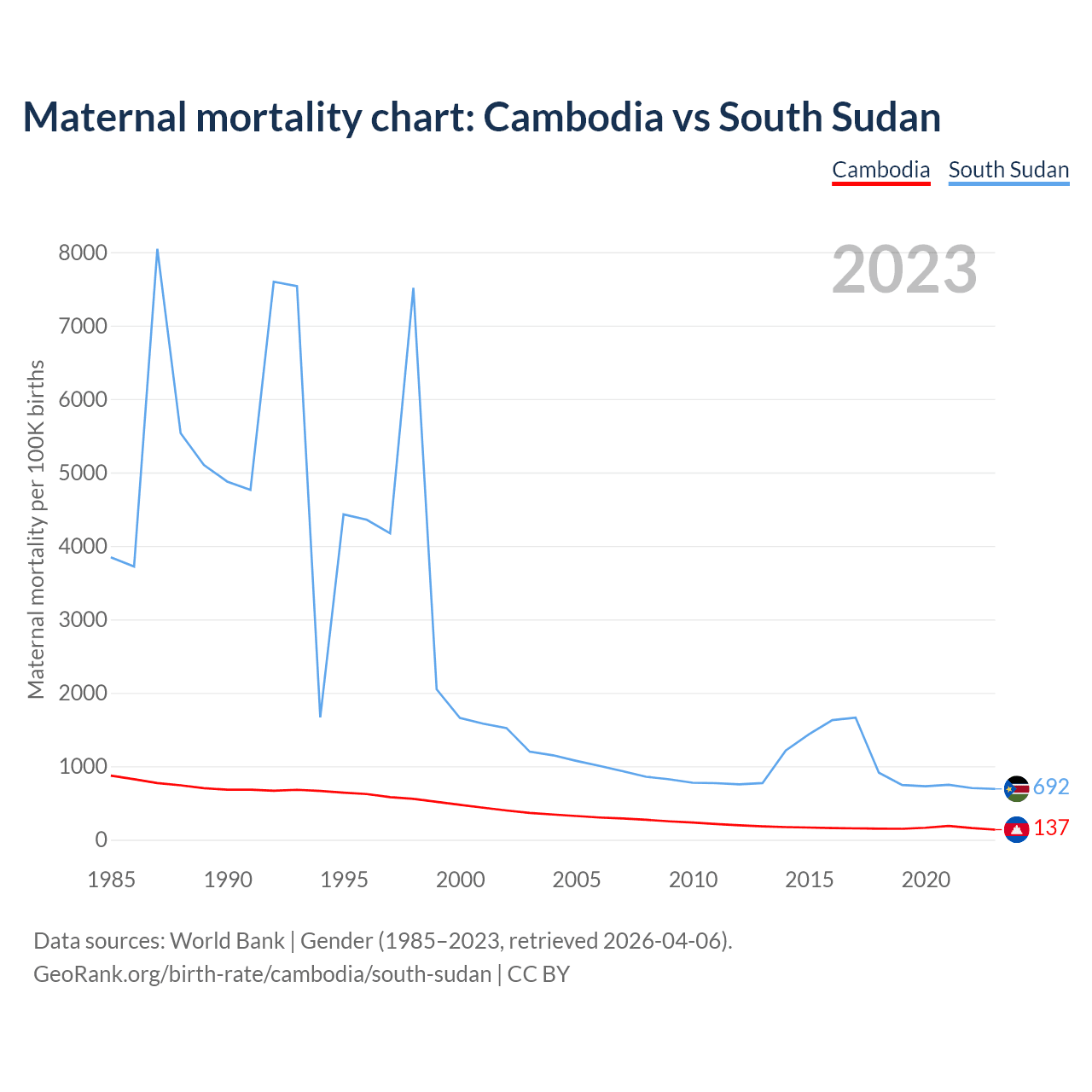 The maternal mortality rate, which is the probability of dying during childbirth or within 42 days of pregnancy termination, is 137 deaths per 100,000 live births in Cambodia, compared to 692 deaths in South Sudan.