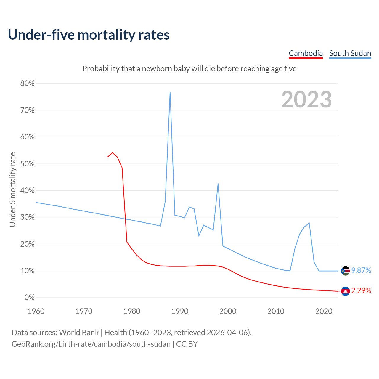 The chance that a newborn baby will die before reaching age five is 2.29% in Cambodia and 9.87% in South Sudan. Above is a chart with historical data on under-five mortality rates.