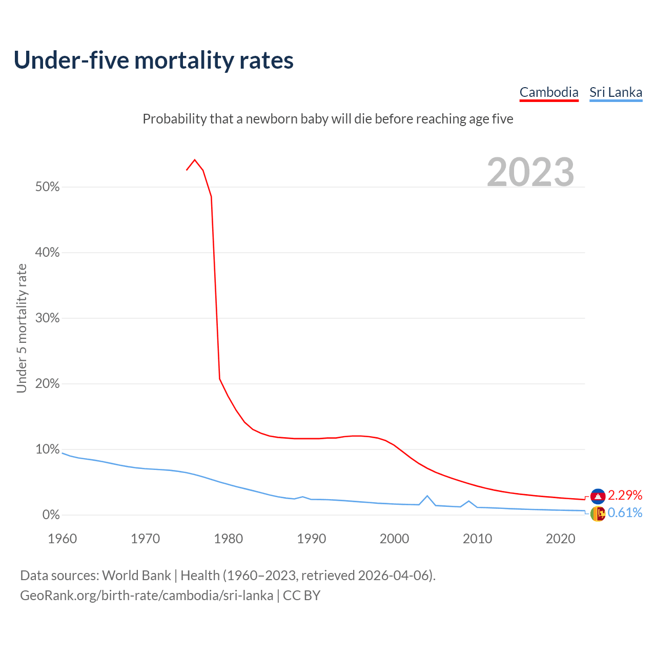 The chance that a newborn baby will die before reaching age five is 2.29% in Cambodia and 0.61% in Sri Lanka. Above is a chart with historical data on under-five mortality rates.