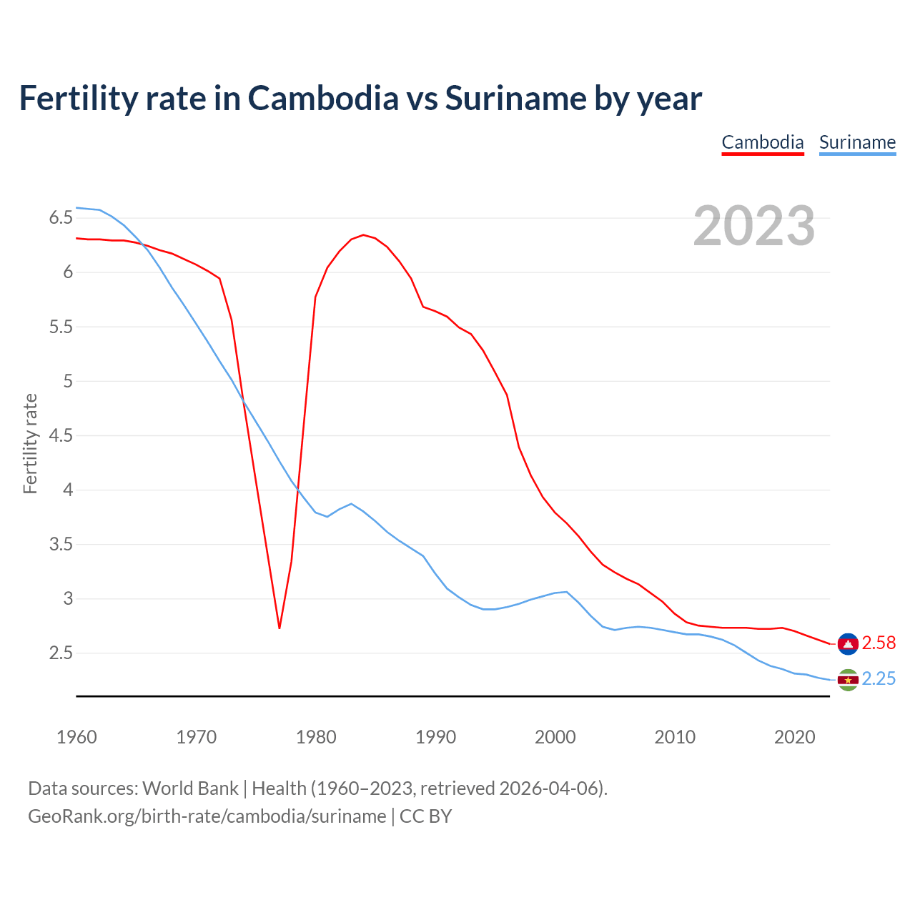 1960 vs 2023, the fertility rate has decreased by 59.1% in Cambodia and by 65.9% in Suriname — in 1960, it was 6.31 and 6.59, respectively.