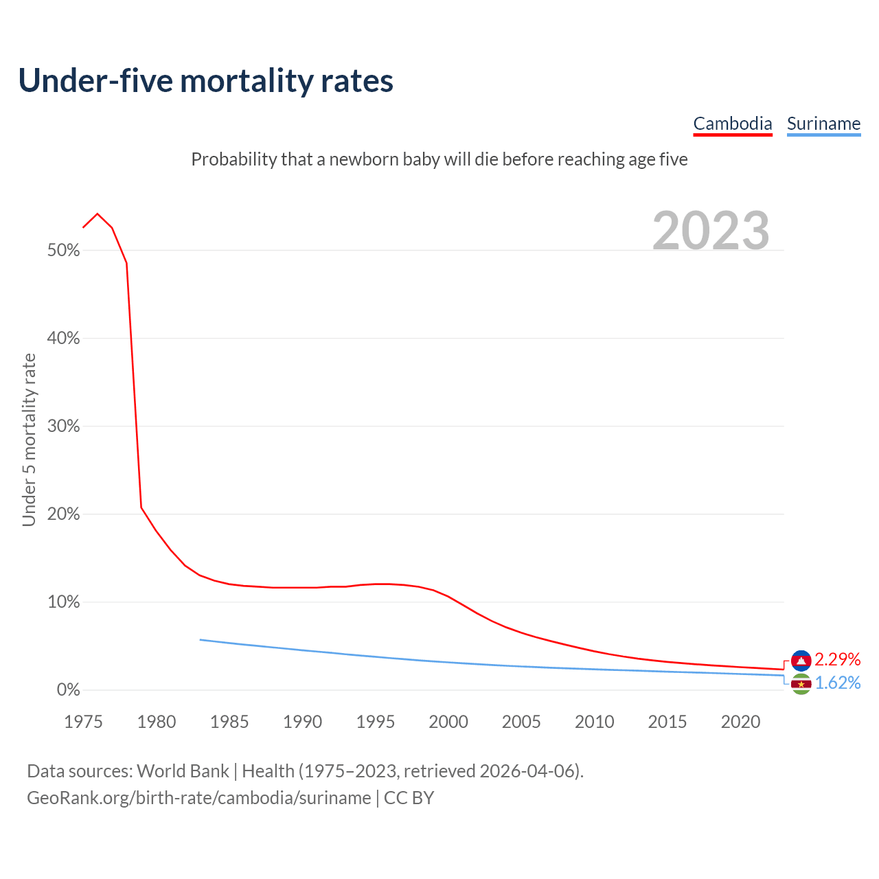 The chance that a newborn baby will die before reaching age five is 2.29% in Cambodia and 1.62% in Suriname. Above is a chart with historical data on under-five mortality rates.