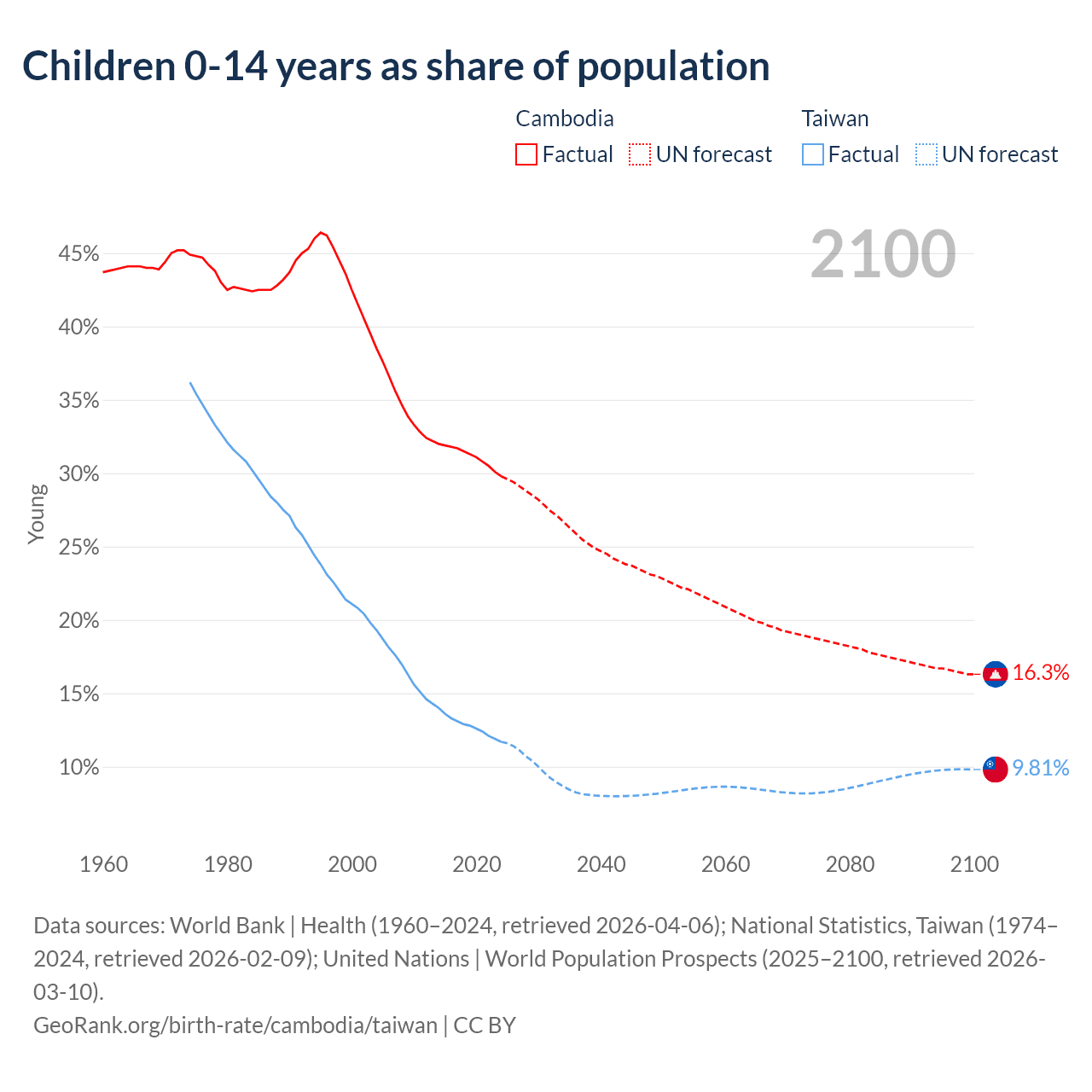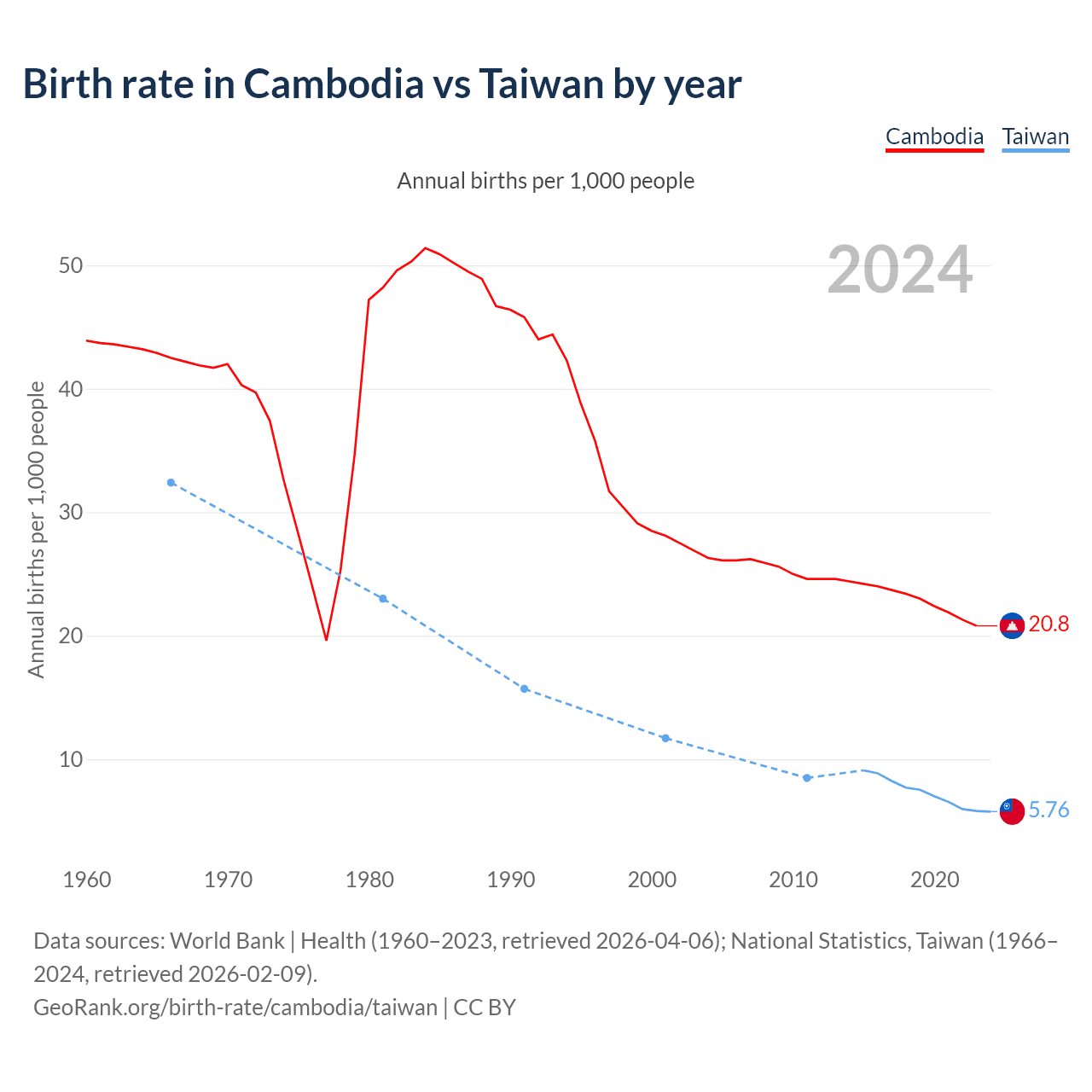 Cambodia has an annual birth rate of 20.8 births per 1,000 people, compared to 5.76 for Taiwan. The average number of children a woman is expected to have during her lifetime — the fertility rate, is 2.58 in Cambodia and 0.89 in Taiwan — 65.7% difference.