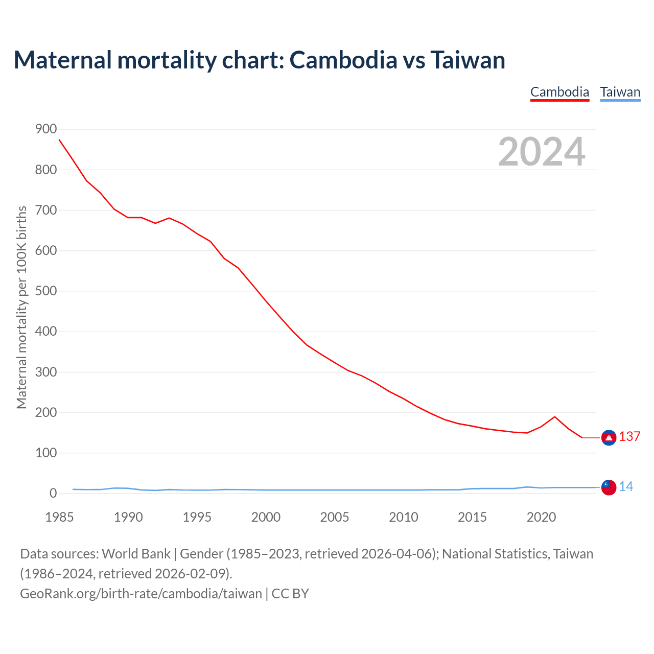 The maternal mortality rate, which is the probability of dying during childbirth or within 42 days of pregnancy termination, is 137 deaths per 100,000 live births in Cambodia, compared to 14 deaths in Taiwan.