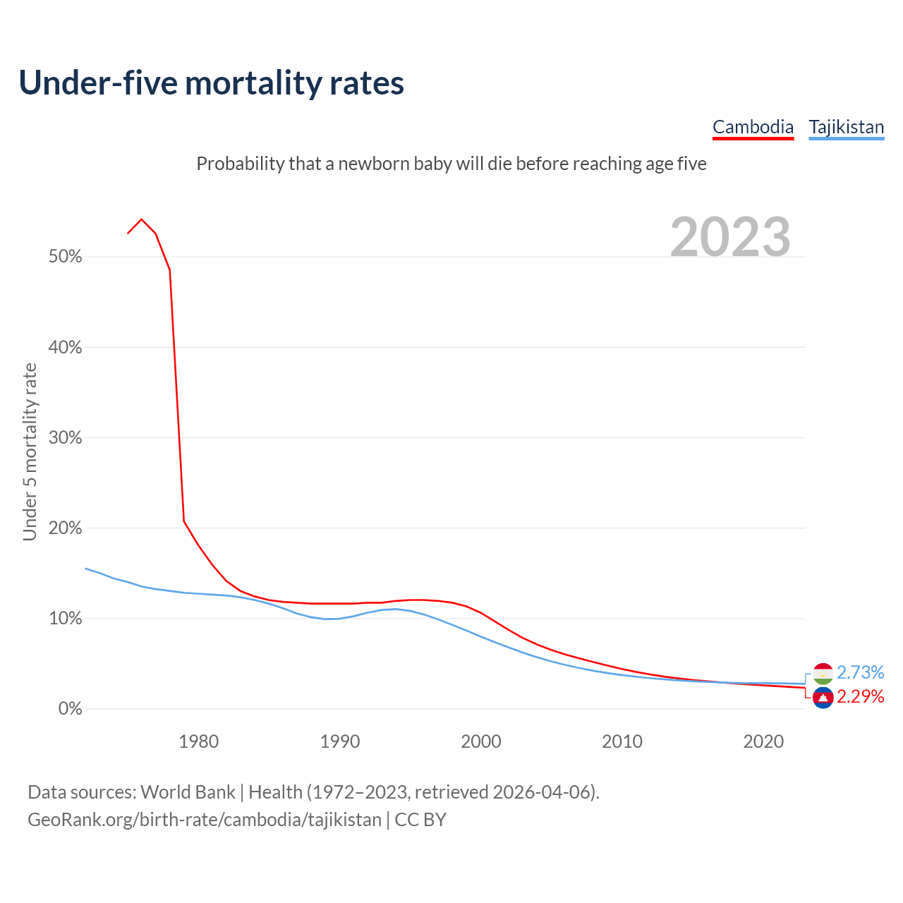 The chance that a newborn baby will die before reaching age five is 2.29% in Cambodia and 2.73% in Tajikistan. Above is a chart with historical data on under-five mortality rates.