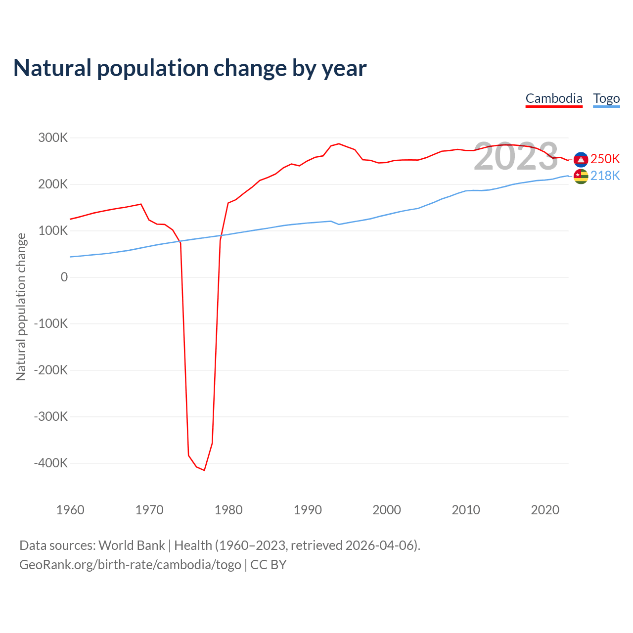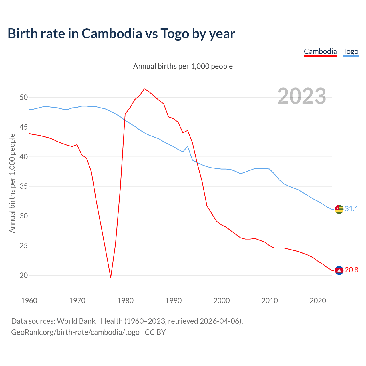 Cambodia has an annual birth rate of 20.8 births per 1,000 people, compared to 31.1 for Togo. The average number of children a woman is expected to have during her lifetime — the fertility rate, is 2.58 in Cambodia and 4.19 in Togo — 62.5% difference.