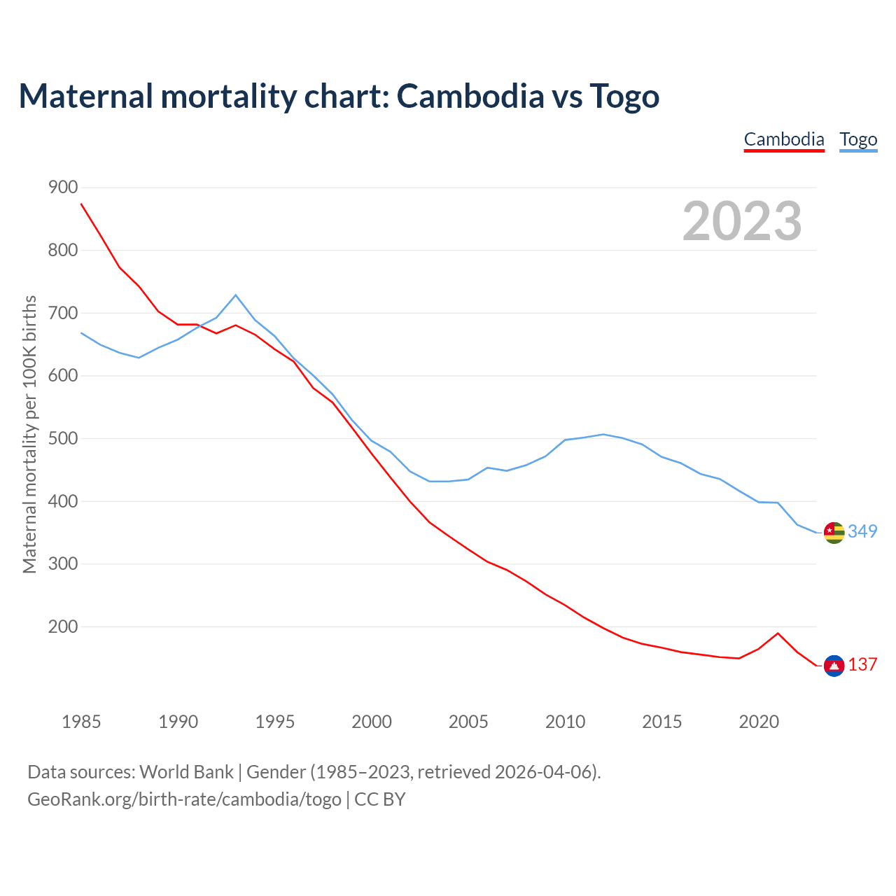 The maternal mortality rate, which is the probability of dying during childbirth or within 42 days of pregnancy termination, is 137 deaths per 100,000 live births in Cambodia, compared to 349 deaths in Togo.