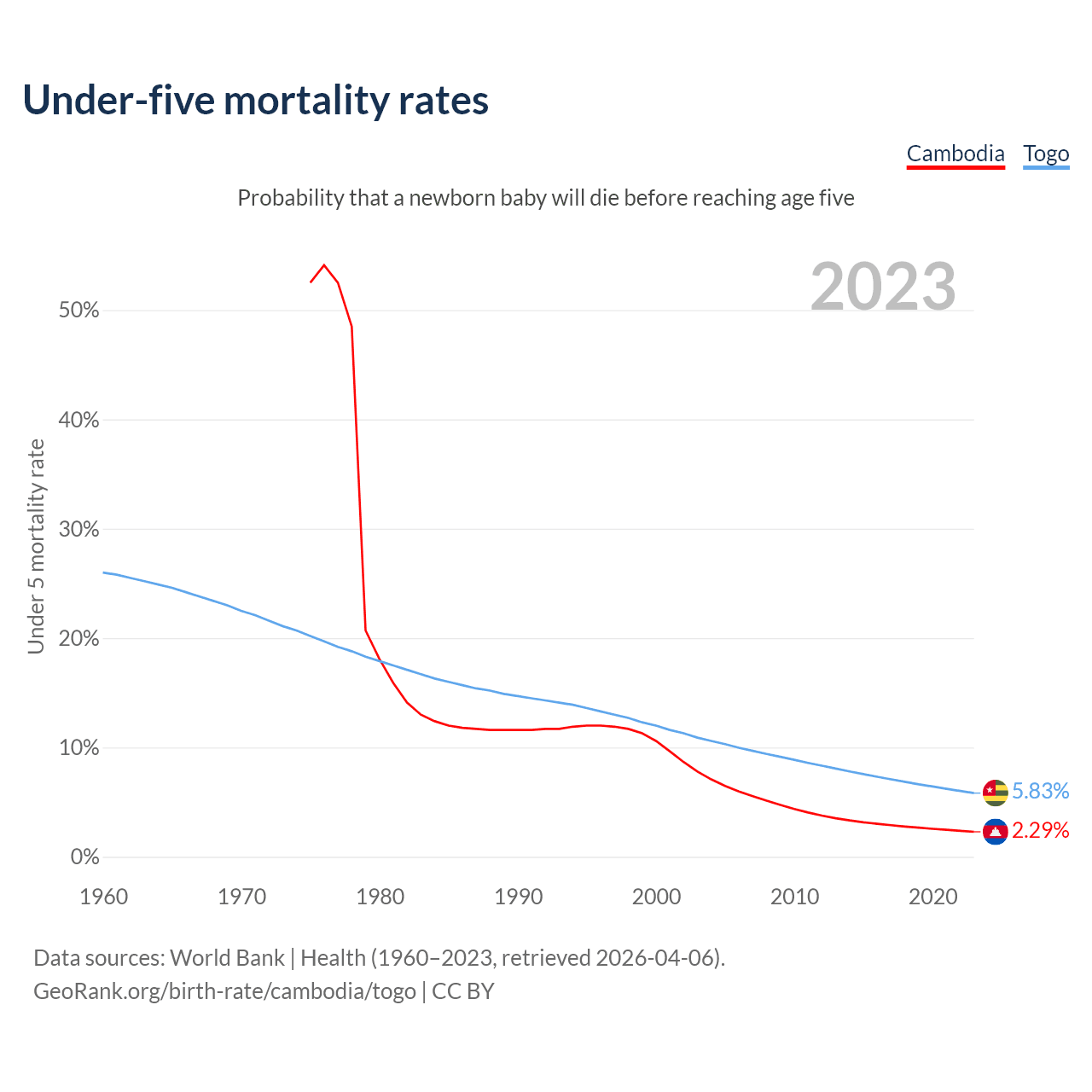 The chance that a newborn baby will die before reaching age five is 2.29% in Cambodia and 5.83% in Togo. Above is a chart with historical data on under-five mortality rates.