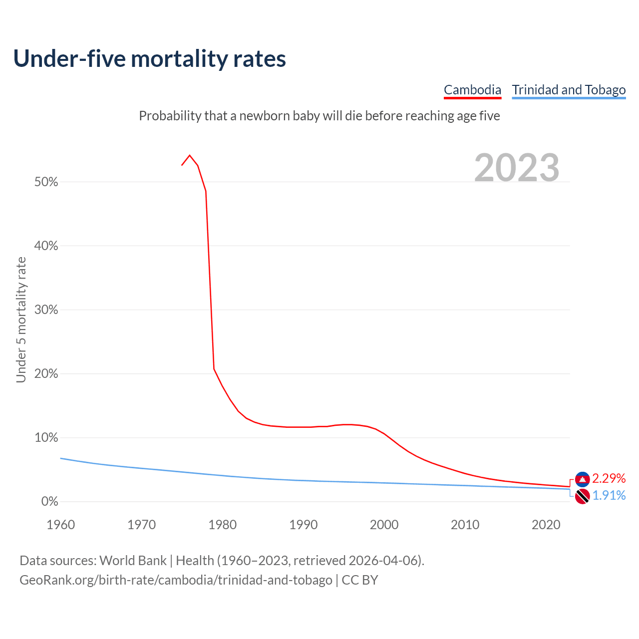 The chance that a newborn baby will die before reaching age five is 2.29% in Cambodia and 1.91% in Trinidad and Tobago. Above is a chart with historical data on under-five mortality rates.