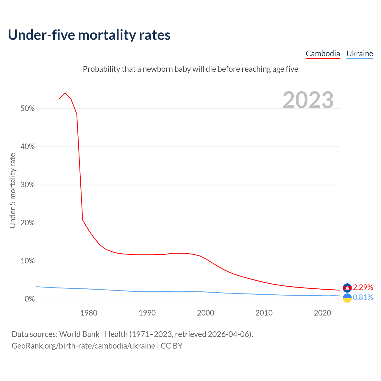 The chance that a newborn baby will die before reaching age five is 2.29% in Cambodia and 0.81% in Ukraine. Above is a chart with historical data on under-five mortality rates.