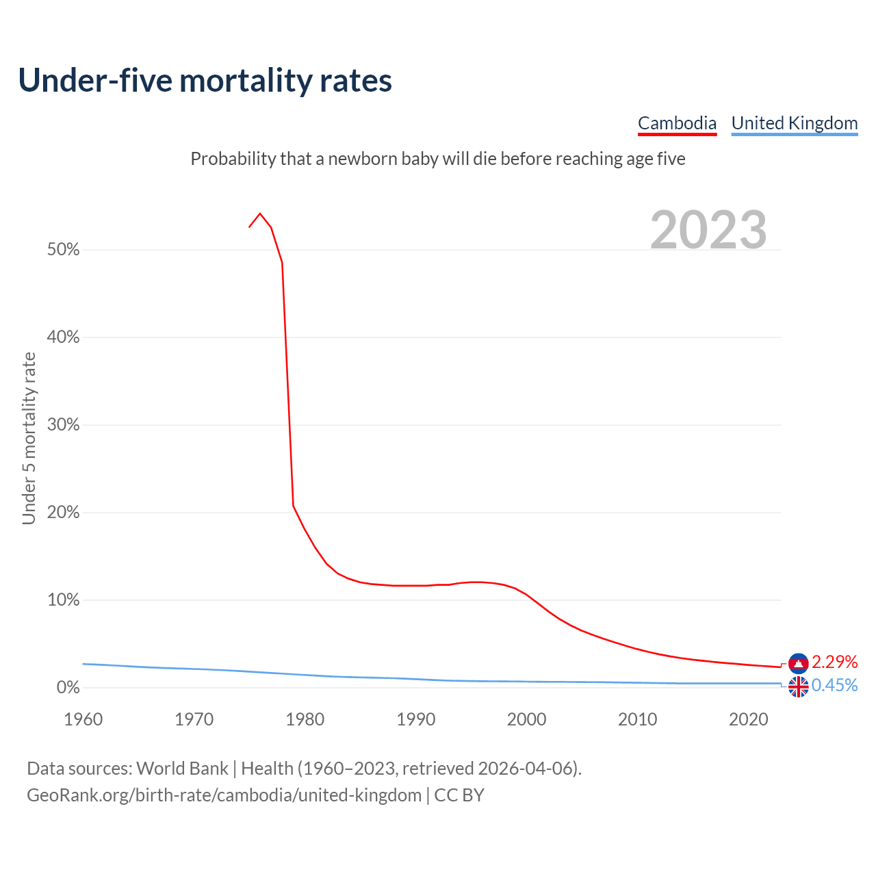 The chance that a newborn baby will die before reaching age five is 2.29% in Cambodia and 0.45% in the United Kingdom. Above is a chart with historical data on under-five mortality rates.