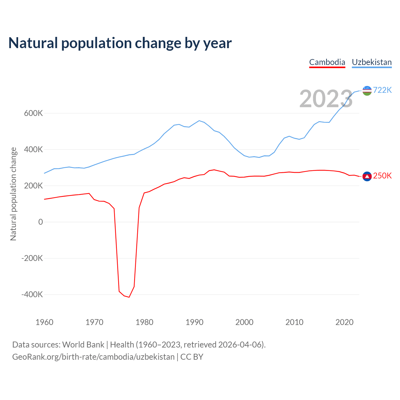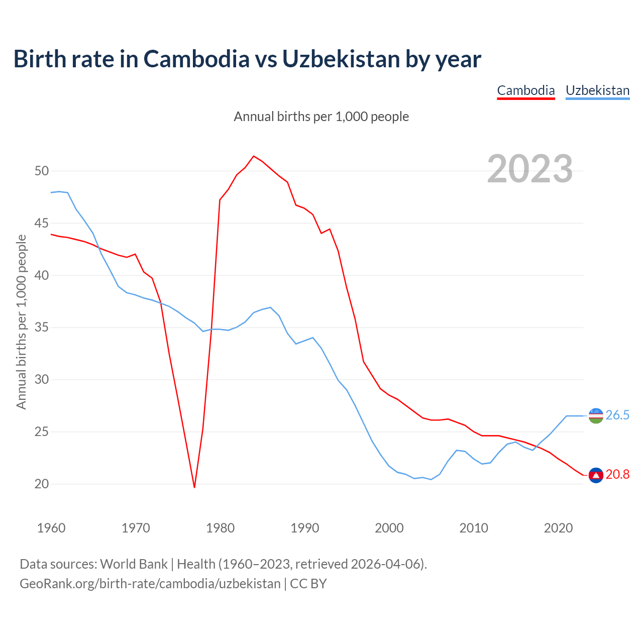 Cambodia has an annual birth rate of 20.8 births per 1,000 people, compared to 26.5 for Uzbekistan. The average number of children a woman is expected to have during her lifetime — the fertility rate, is 2.58 in Cambodia and 3.5 in Uzbekistan — 35.7% difference.