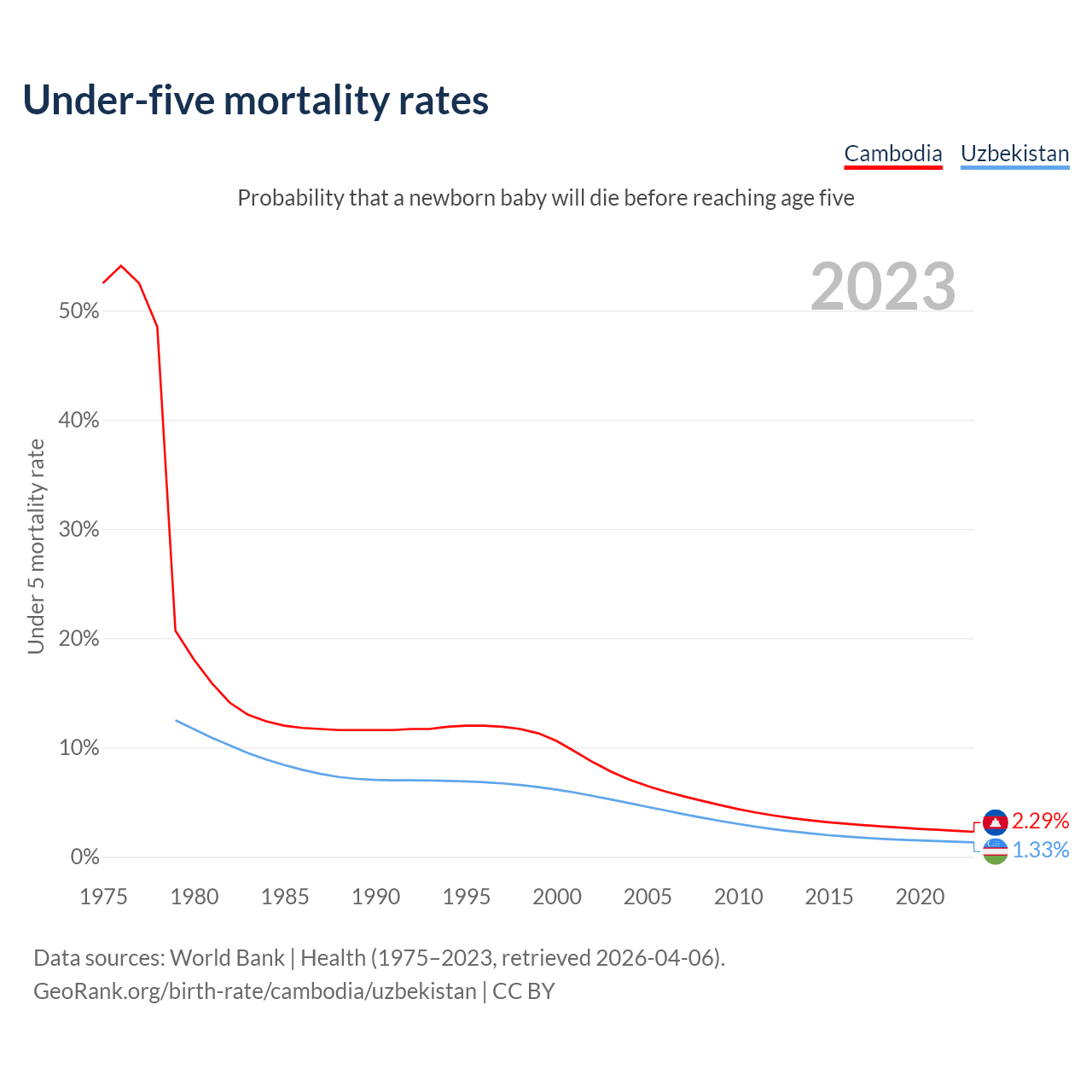 The chance that a newborn baby will die before reaching age five is 2.29% in Cambodia and 1.33% in Uzbekistan. Above is a chart with historical data on under-five mortality rates.