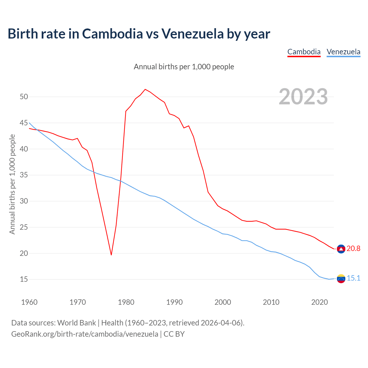Cambodia has an annual birth rate of 20.8 births per 1,000 people, compared to 15.1 for Venezuela. The average number of children a woman is expected to have during her lifetime — the fertility rate, is 2.58 in Cambodia and 2.08 in Venezuela — 19.4% difference.