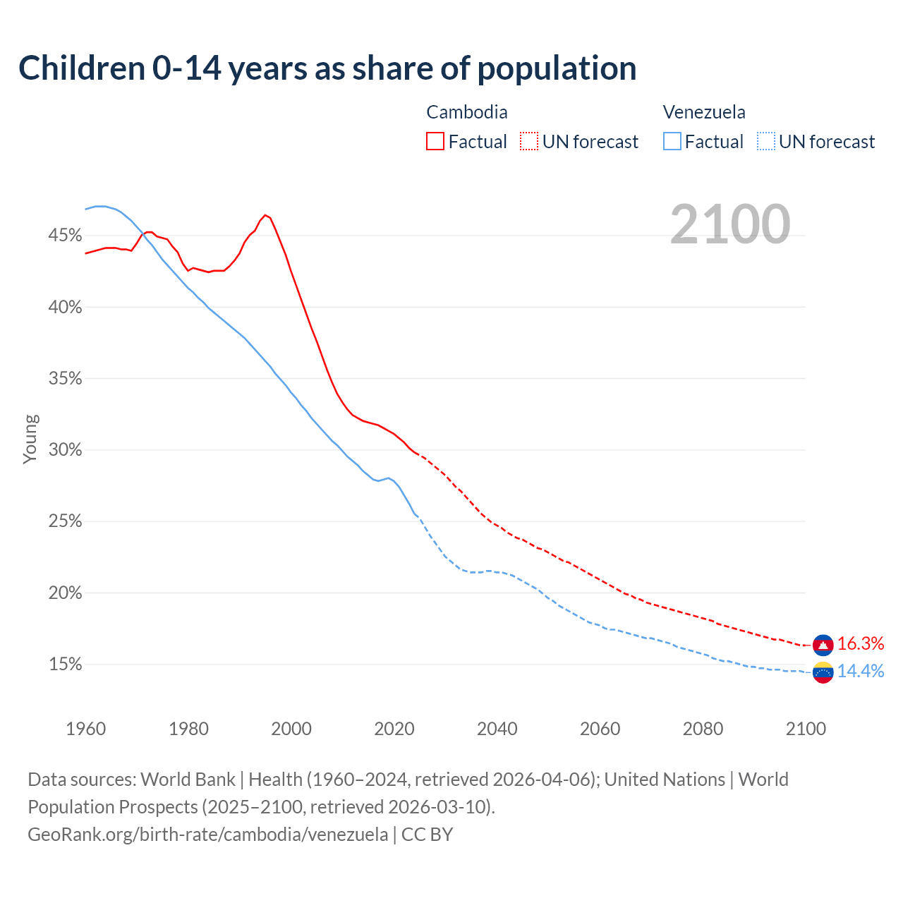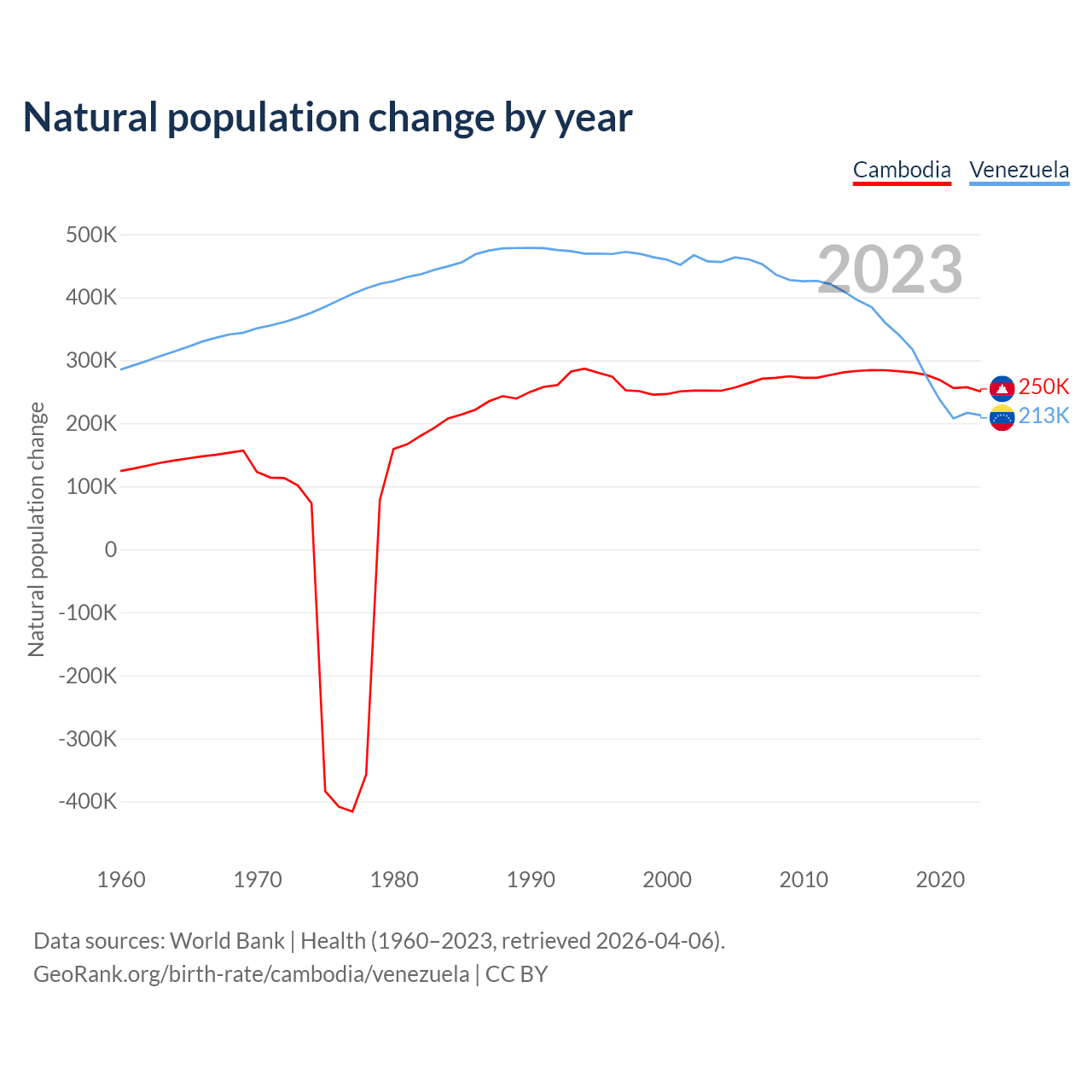According to the latest available data on birth rates, the fertility rate in Cambodia was 2.58 children per woman in 2023, compared to 2.08 in Venezuela in 2023. The replacement level is considered to be 2.1 children per woman.
