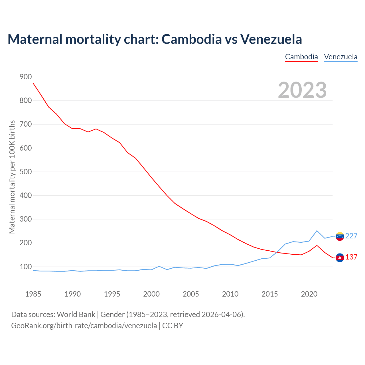 The maternal mortality rate, which is the probability of dying during childbirth or within 42 days of pregnancy termination, is 137 deaths per 100,000 live births in Cambodia, compared to 227 deaths in Venezuela.