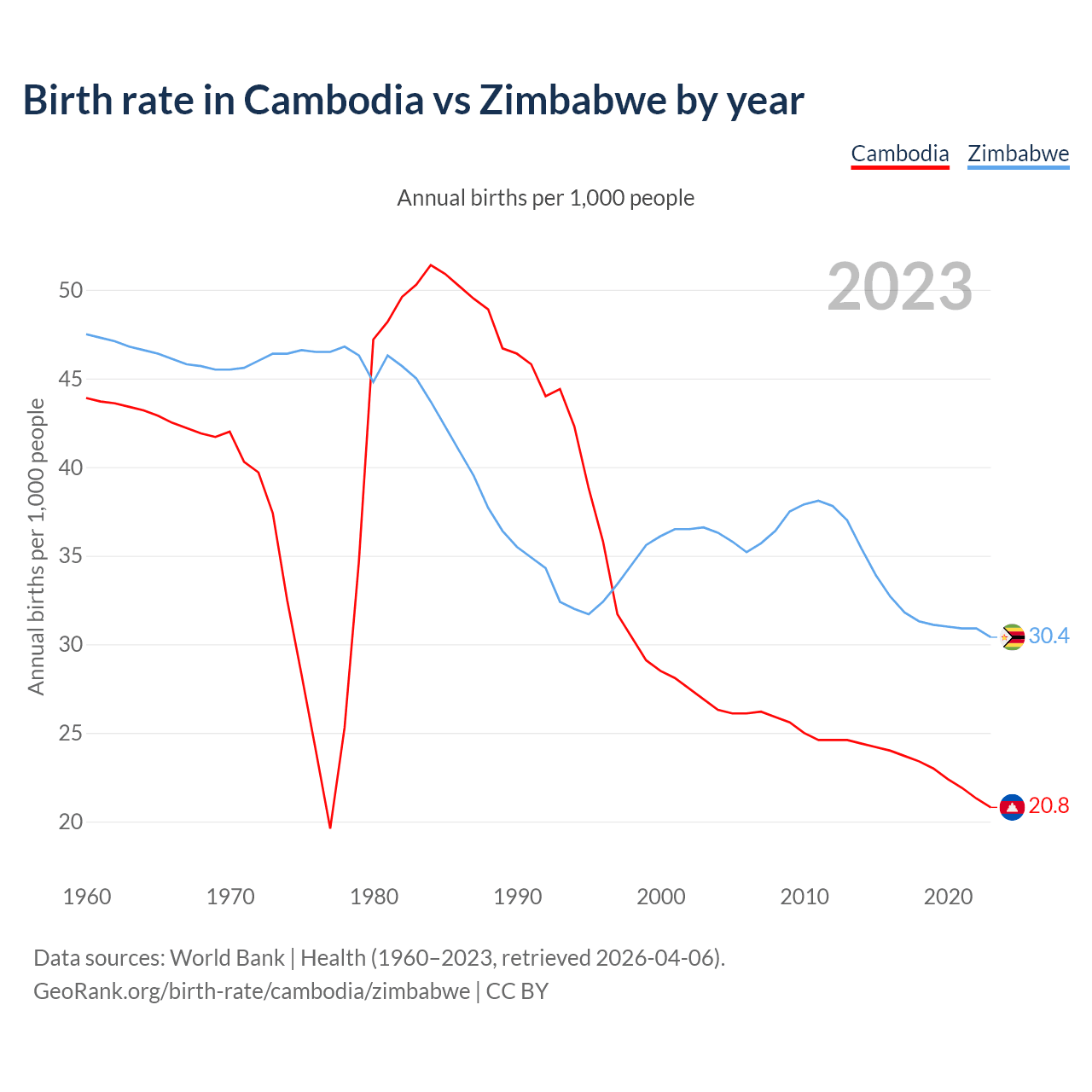 Cambodia has an annual birth rate of 20.8 births per 1,000 people, compared to 30.4 for Zimbabwe. The average number of children a woman is expected to have during her lifetime — the fertility rate, is 2.58 in Cambodia and 3.72 in Zimbabwe — 44.4% difference.