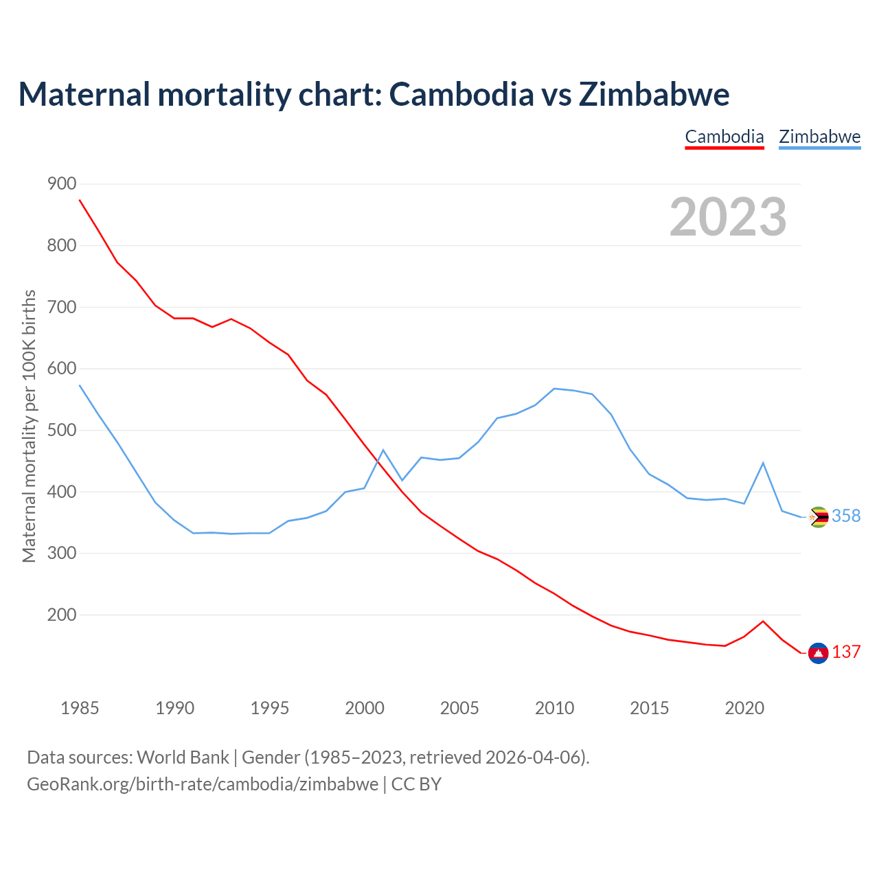 The maternal mortality rate, which is the probability of dying during childbirth or within 42 days of pregnancy termination, is 137 deaths per 100,000 live births in Cambodia, compared to 358 deaths in Zimbabwe.