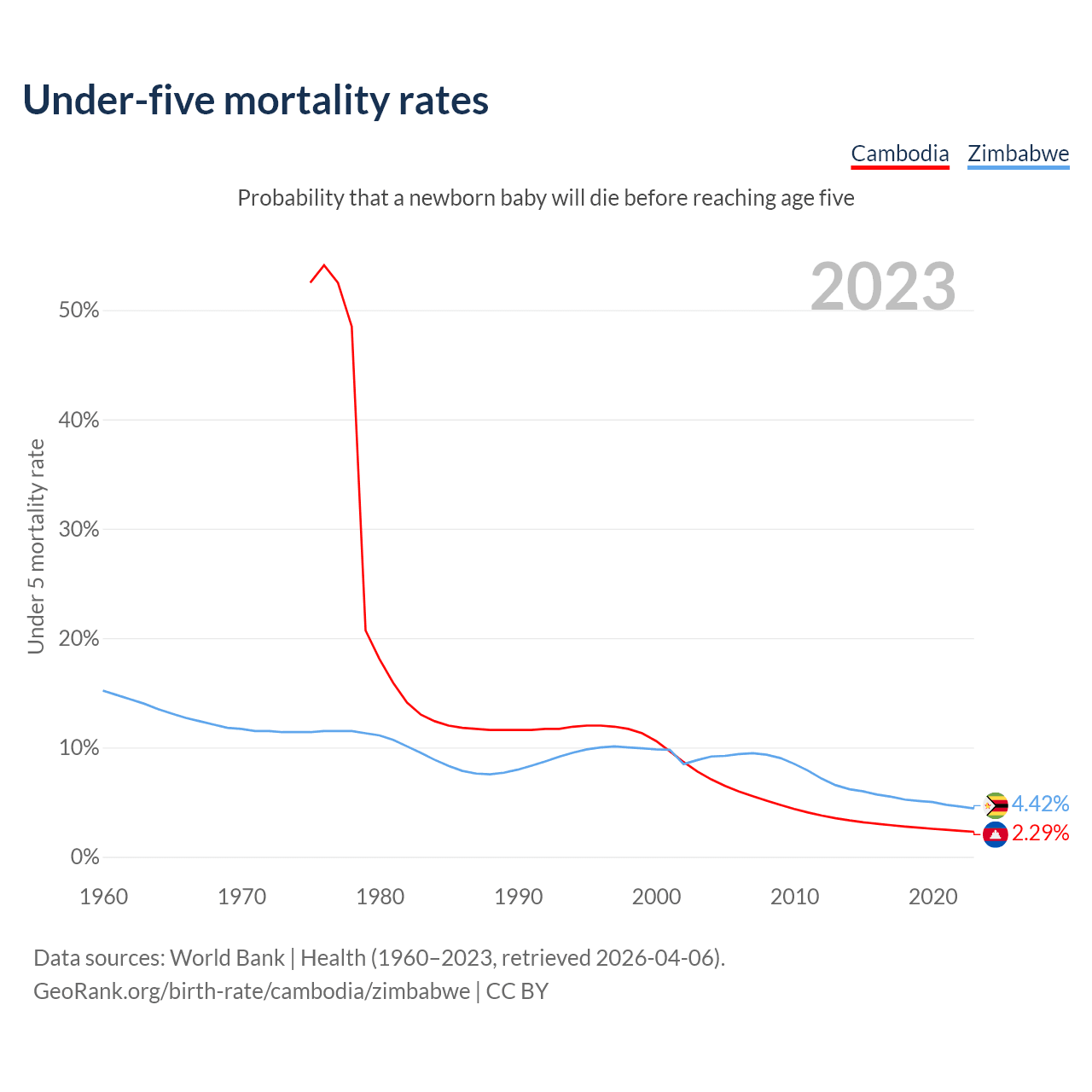 The chance that a newborn baby will die before reaching age five is 2.29% in Cambodia and 4.42% in Zimbabwe. Above is a chart with historical data on under-five mortality rates.