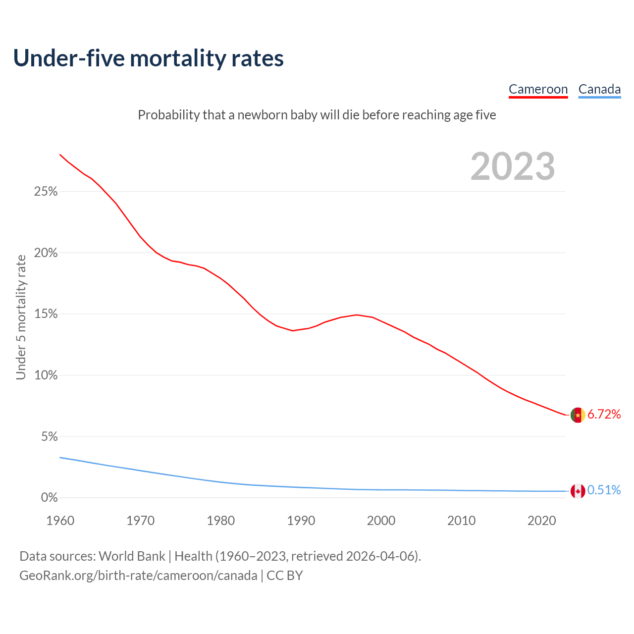 The chance that a newborn baby will die before reaching age five is 6.72% in Cameroon and 0.51% in Canada. Above is a chart with historical data on under-five mortality rates.