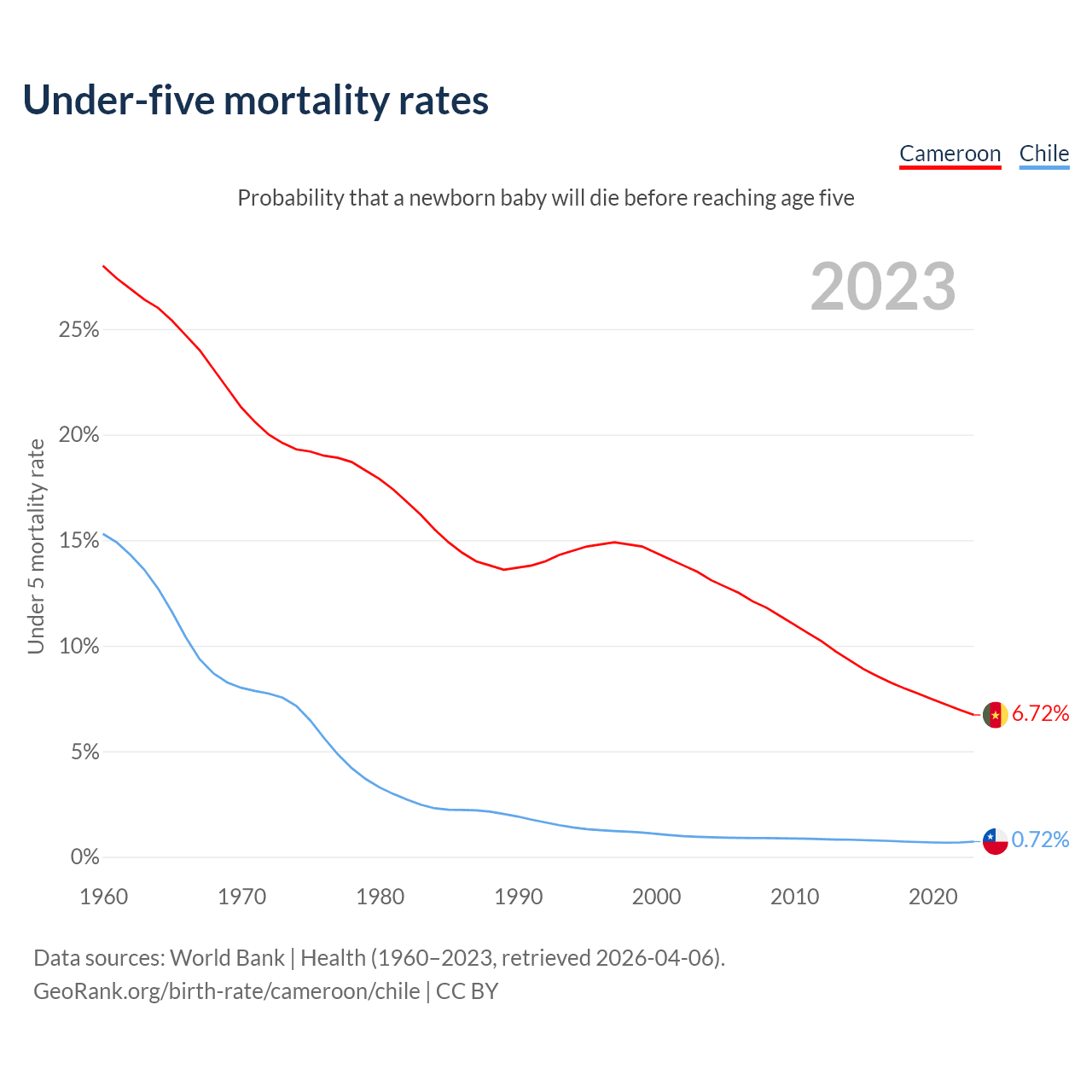 The chance that a newborn baby will die before reaching age five is 6.72% in Cameroon and 0.72% in Chile. Above is a chart with historical data on under-five mortality rates.