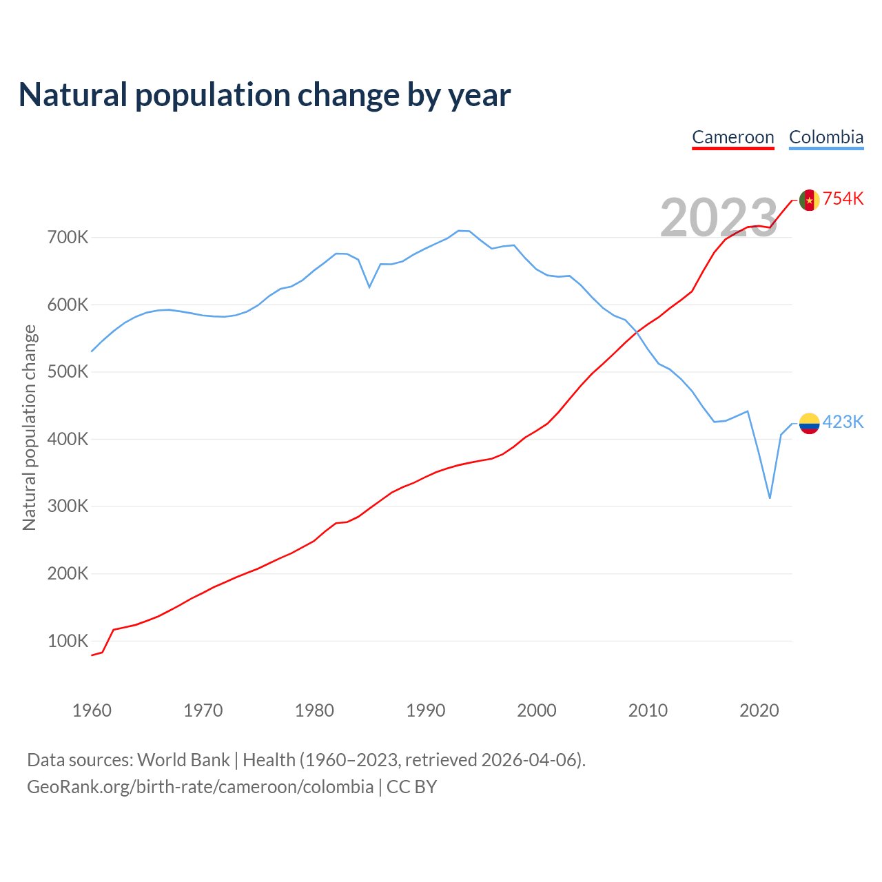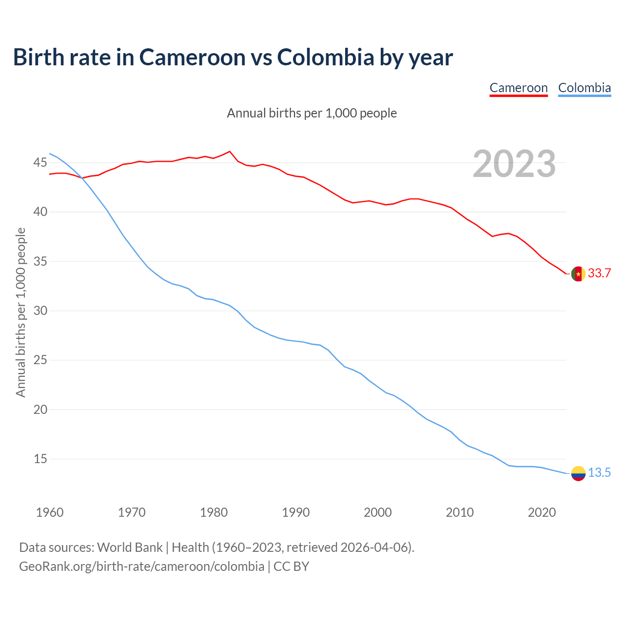Cameroon has an annual birth rate of 33.7 births per 1,000 people, compared to 13.5 for Colombia. The average number of children a woman is expected to have during her lifetime — the fertility rate, is 4.32 in Cameroon and 1.65 in Colombia — 61.9% difference.