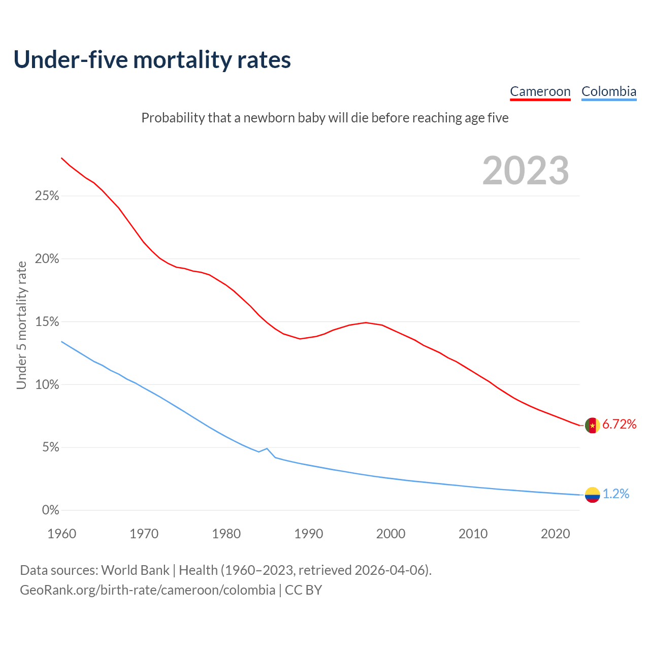The chance that a newborn baby will die before reaching age five is 6.72% in Cameroon and 1.2% in Colombia. Above is a chart with historical data on under-five mortality rates.