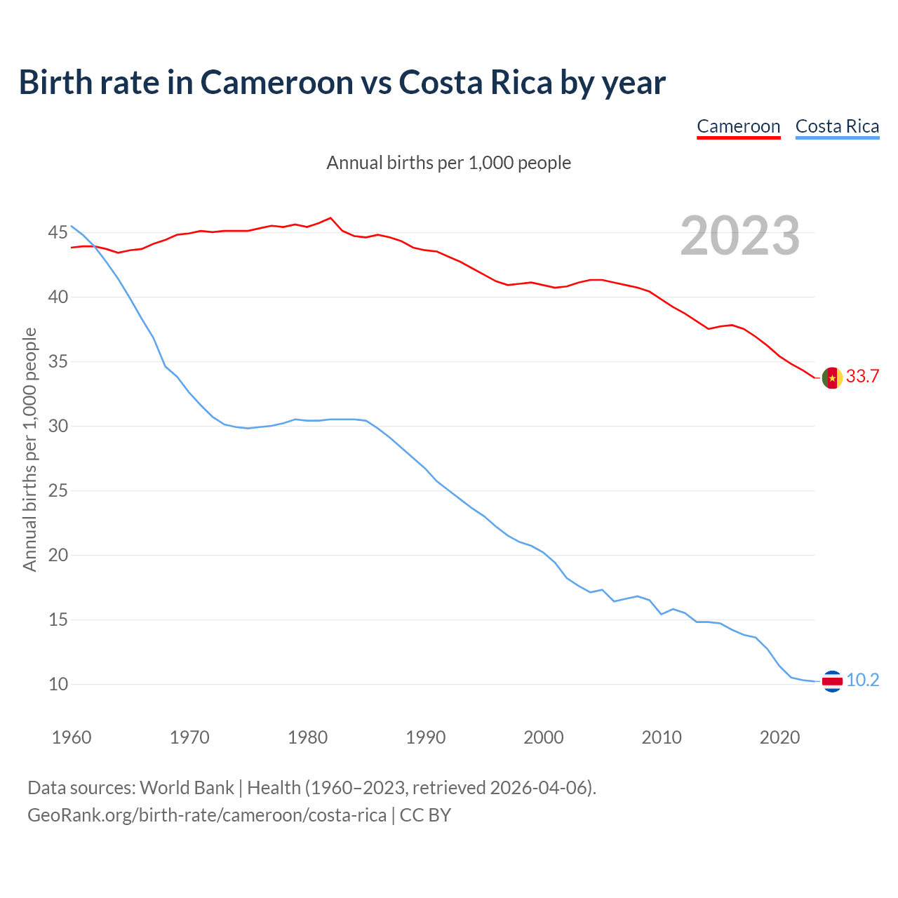 Cameroon has an annual birth rate of 33.7 births per 1,000 people, compared to 10.2 for Costa Rica. The average number of children a woman is expected to have during her lifetime — the fertility rate, is 4.32 in Cameroon and 1.33 in Costa Rica — 69.2% difference.