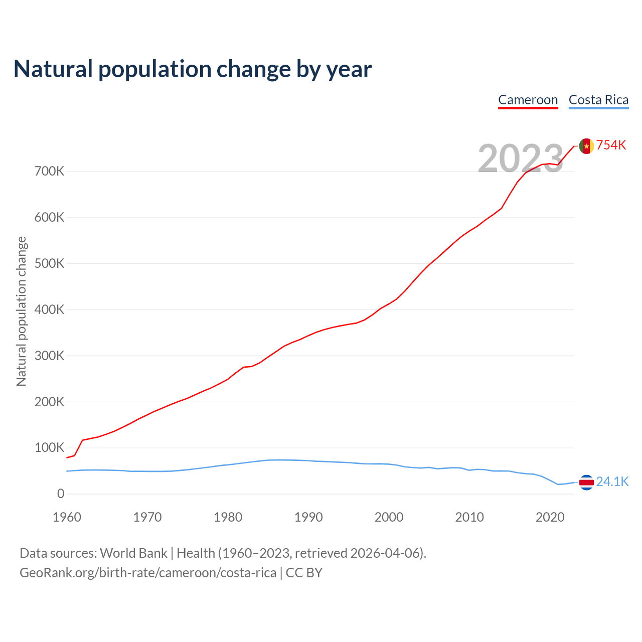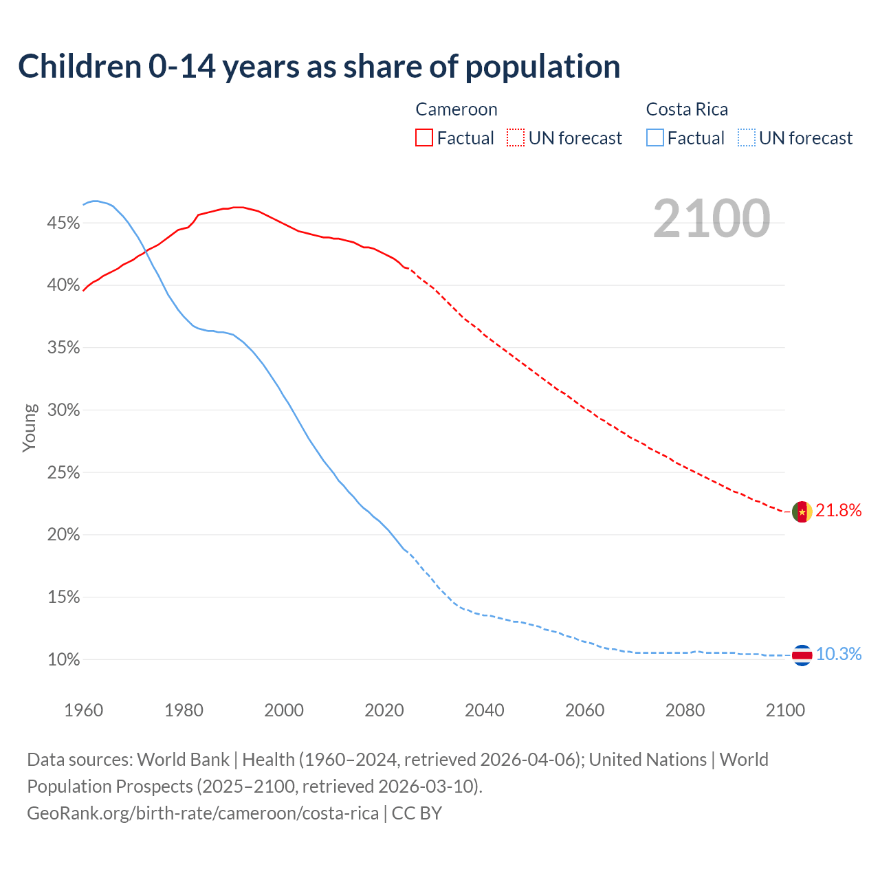 According to the latest available data on birth rates, the fertility rate in Cameroon was 4.32 children per woman in 2023, compared to 1.33 in Costa Rica in 2023. The replacement level is considered to be 2.1 children per woman.