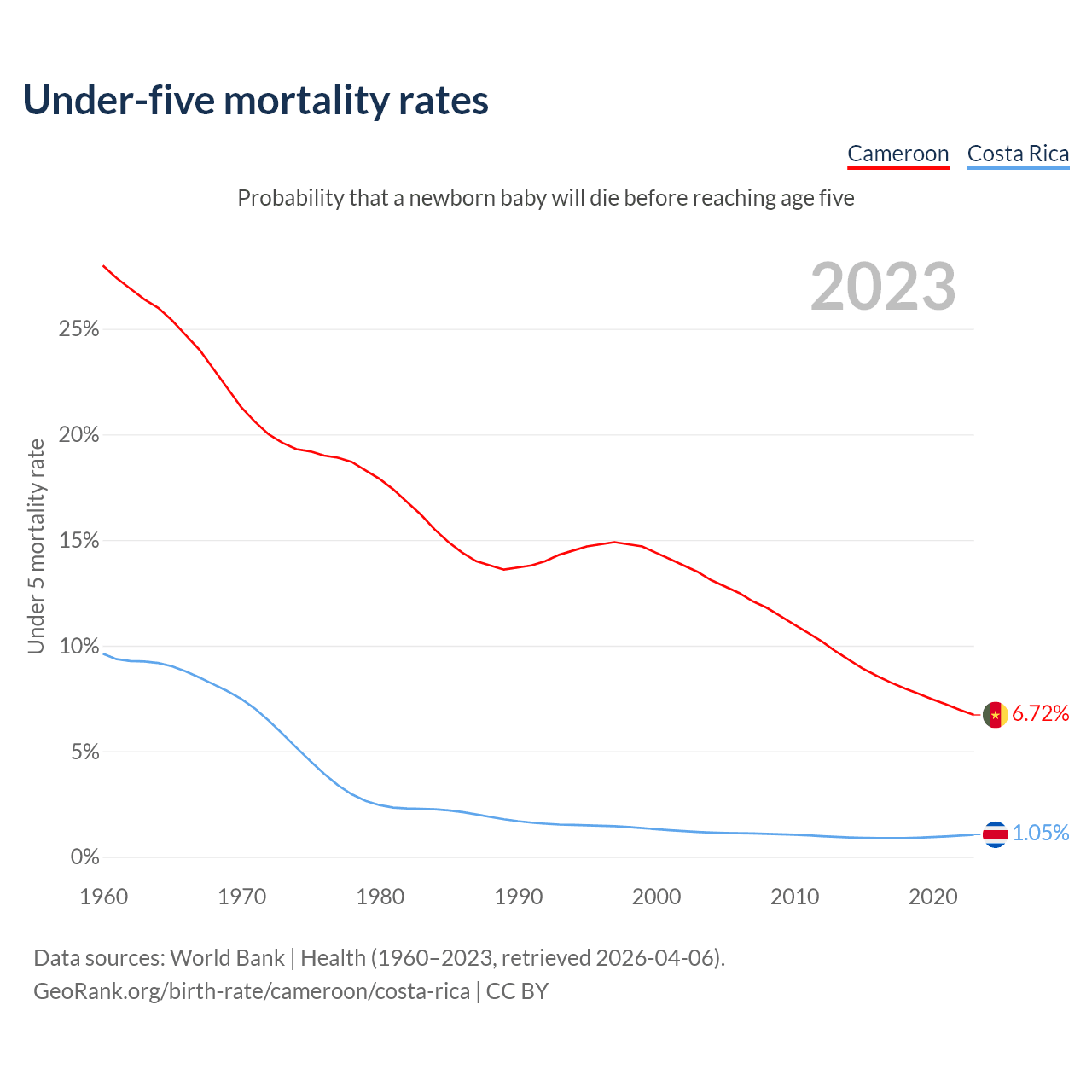 The chance that a newborn baby will die before reaching age five is 6.72% in Cameroon and 1.05% in Costa Rica. Above is a chart with historical data on under-five mortality rates.