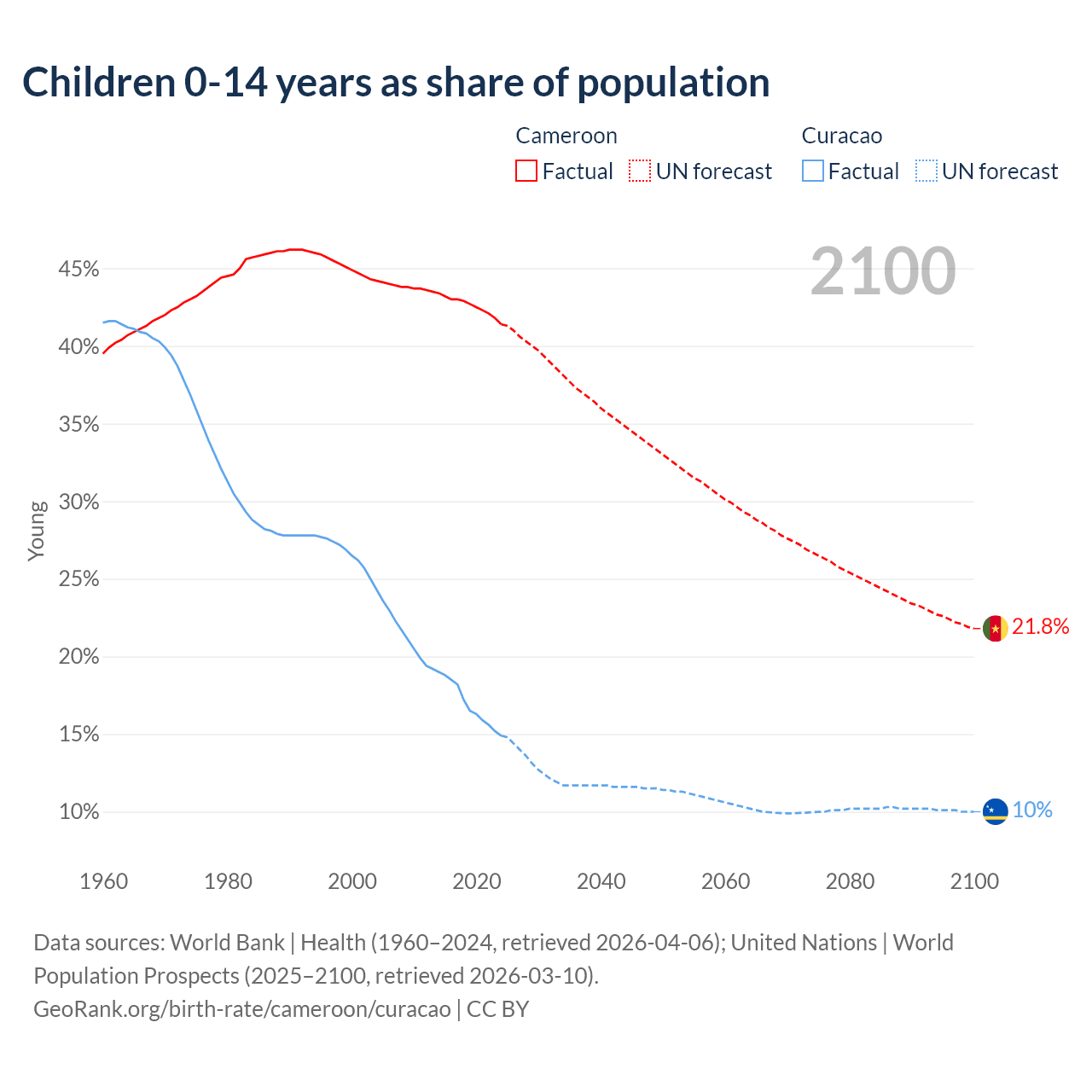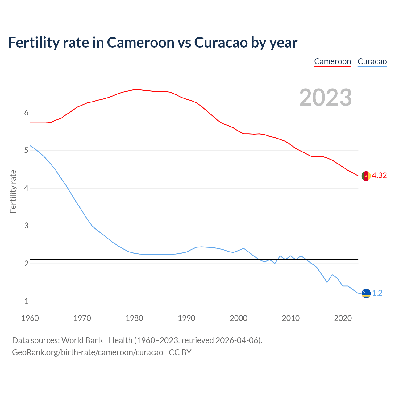 According to the latest available data on birth rates, the fertility rate in Cameroon was 4.32 children per woman in 2023, compared to 1.2 in Curacao in 2023. The replacement level is considered to be 2.1 children per woman.