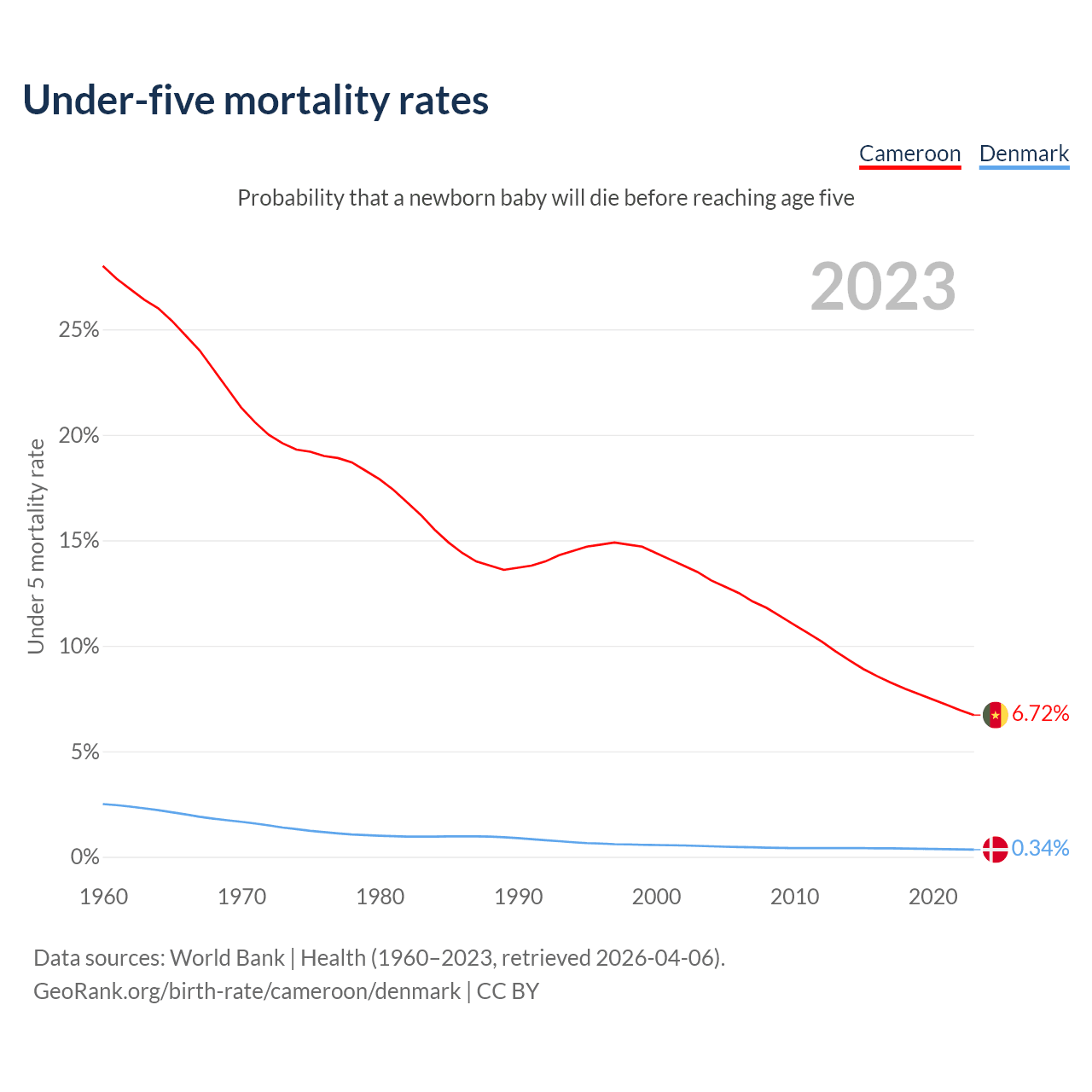 The chance that a newborn baby will die before reaching age five is 6.72% in Cameroon and 0.34% in Denmark. Above is a chart with historical data on under-five mortality rates.