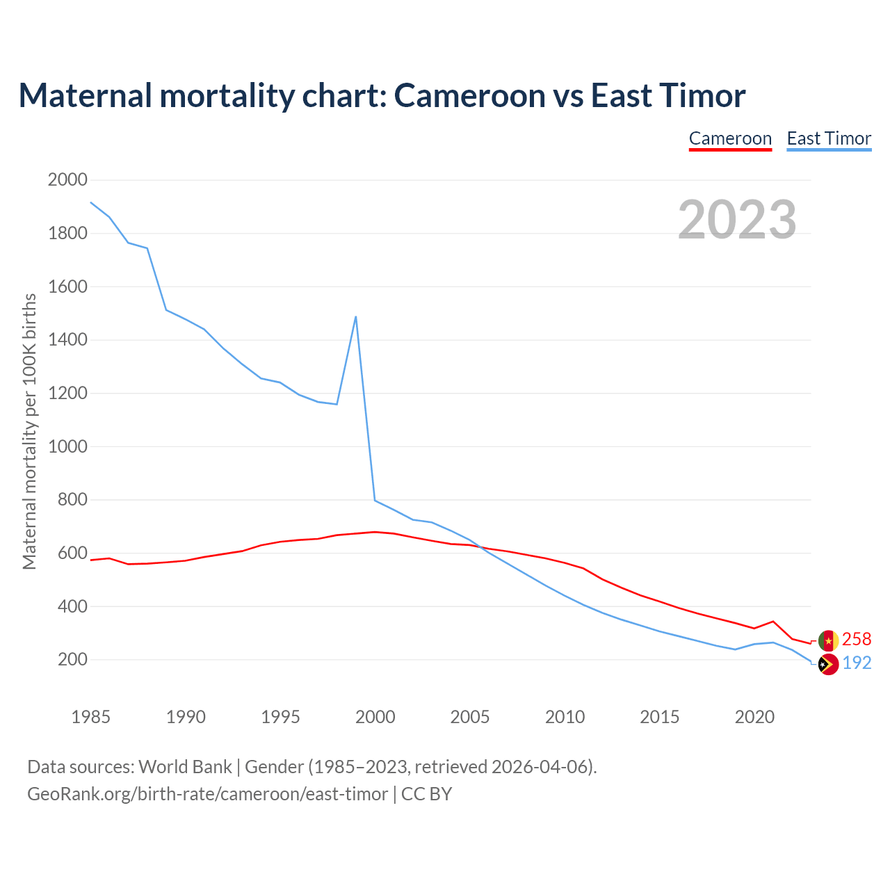 The maternal mortality rate, which is the probability of dying during childbirth or within 42 days of pregnancy termination, is 258 deaths per 100,000 live births in Cameroon, compared to 192 deaths in East Timor.