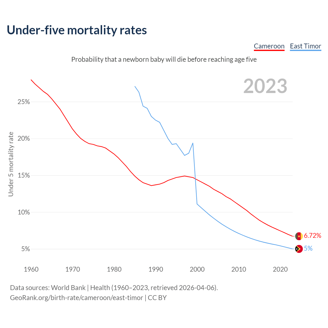 The chance that a newborn baby will die before reaching age five is 6.72% in Cameroon and 5% in East Timor. Above is a chart with historical data on under-five mortality rates.