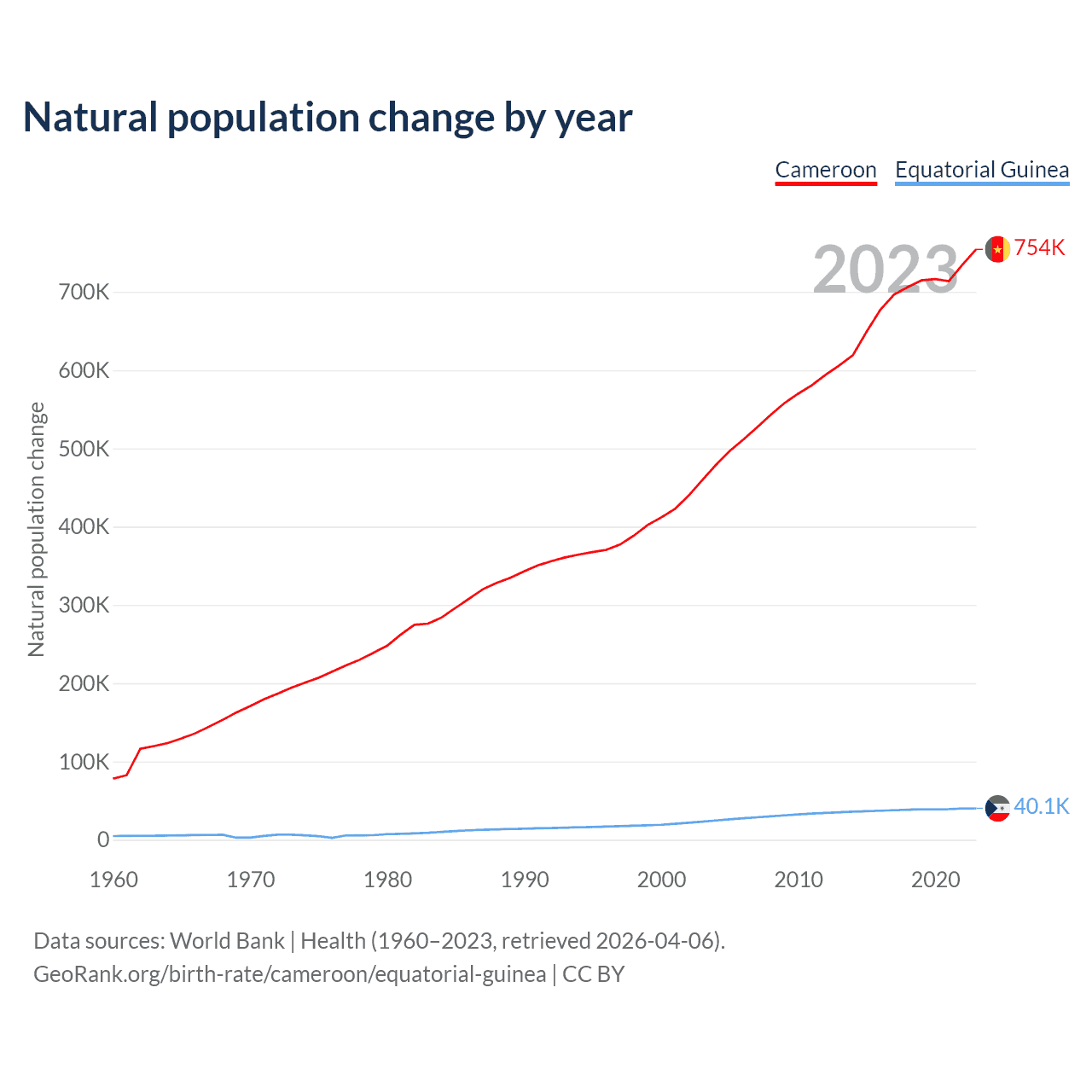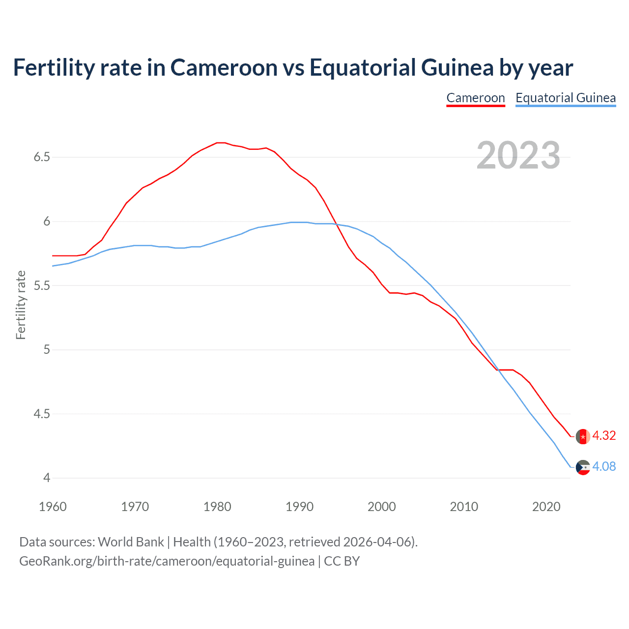 According to the latest available data on birth rates, the fertility rate in Cameroon was 4.32 children per woman in 2023, compared to 4.08 in Equatorial Guinea in 2023. The replacement level is considered to be 2.1 children per woman.