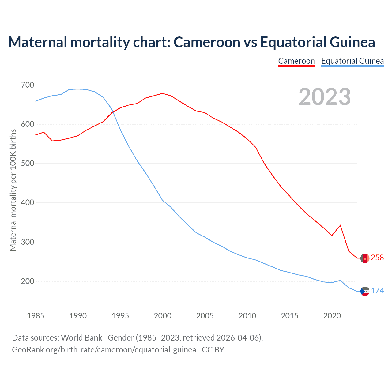 The maternal mortality rate, which is the probability of dying during childbirth or within 42 days of pregnancy termination, is 258 deaths per 100,000 live births in Cameroon, compared to 174 deaths in Equatorial Guinea.