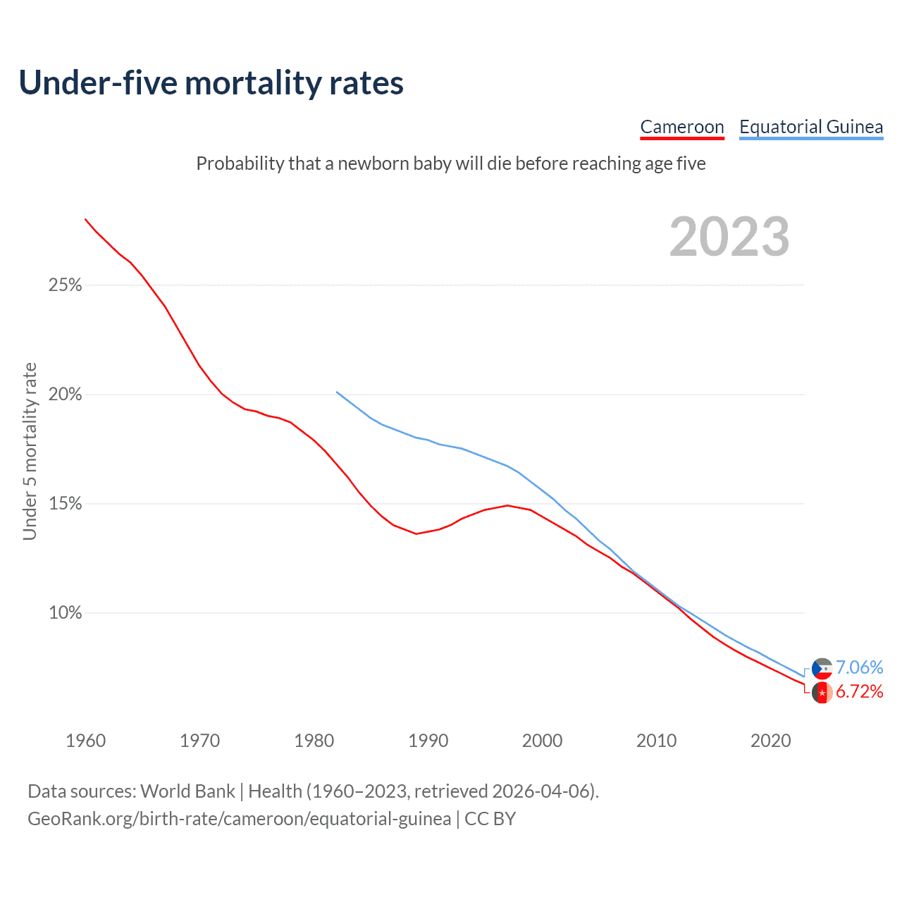 The chance that a newborn baby will die before reaching age five is 6.72% in Cameroon and 7.06% in Equatorial Guinea. Above is a chart with historical data on under-five mortality rates.
